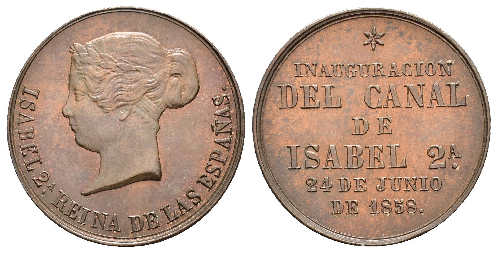 ISABEL II. Medalla. 1858. Inauguración del Canal de Isabel II. AE 7,49 g. 23 mm. Vives-407. B.O. SC.