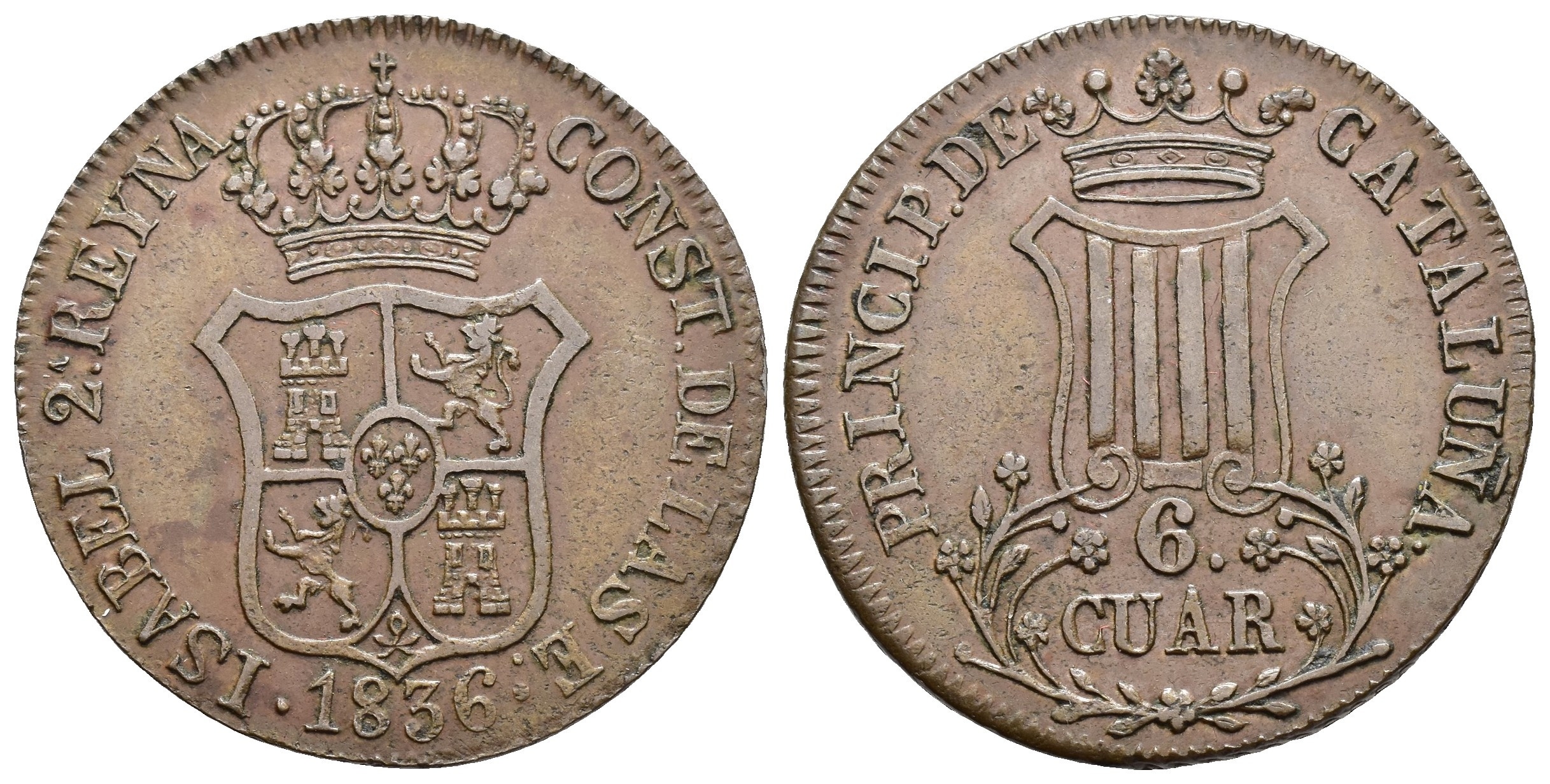 ISABEL II. 6 cuartos. 1836. Cataluña. CU 14,51 g. 32,9 mm. VI-223; AC-15. MBC+/EBC-.