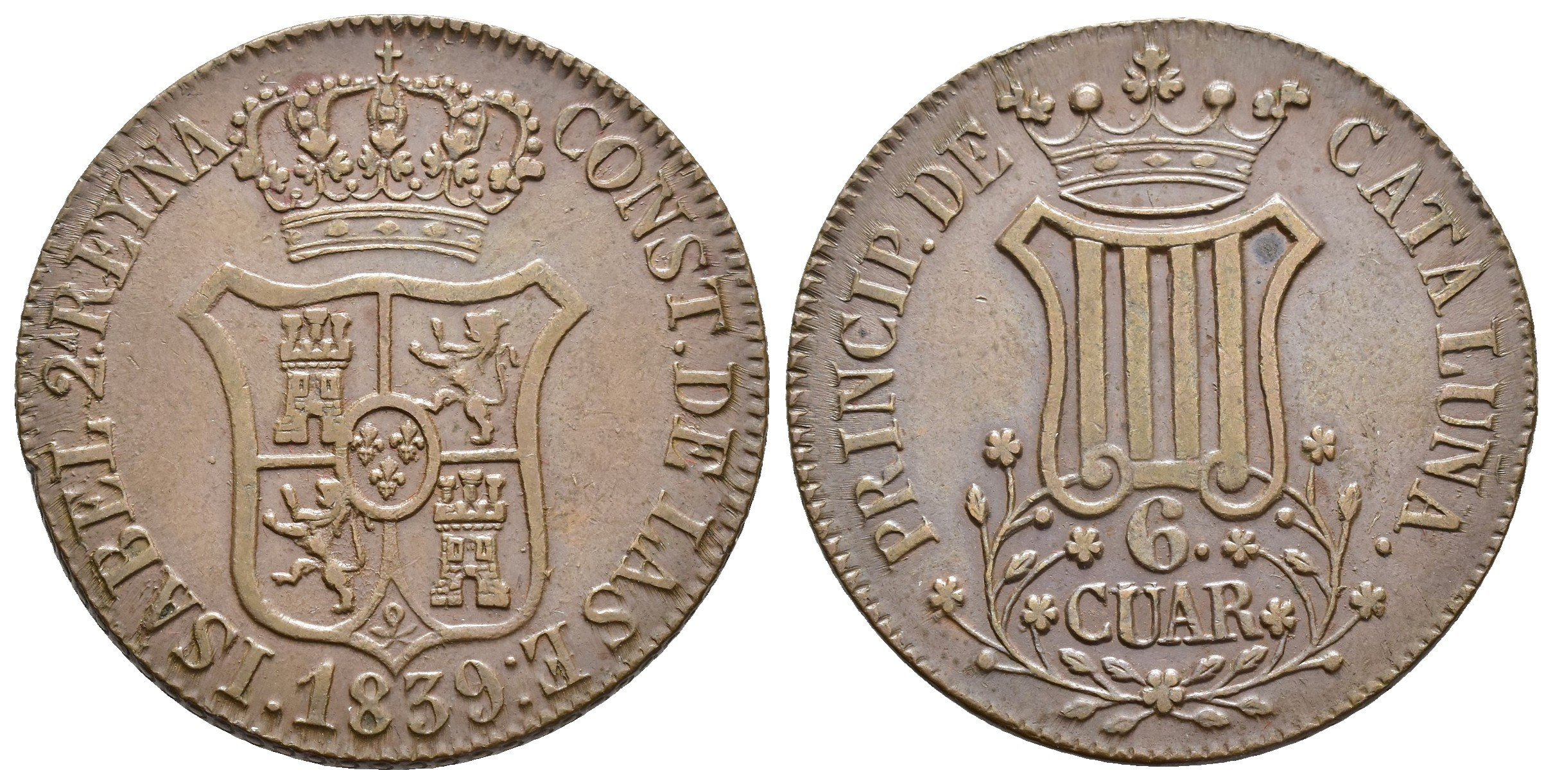 ISABEL II. 6 cuartos. 1839. Cataluña. CU 13,49 g. 32,7 mm. VI-227; AC-20. MBC+.