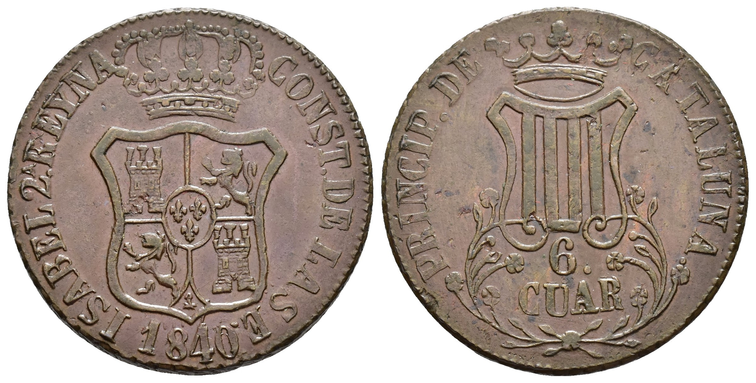 ISABEL II. 6 cuartos. 1840. Cataluña. CU 16,2 g. 32,5 mm. VI-228; AC-21. Pequeñas marcas. EBC-.