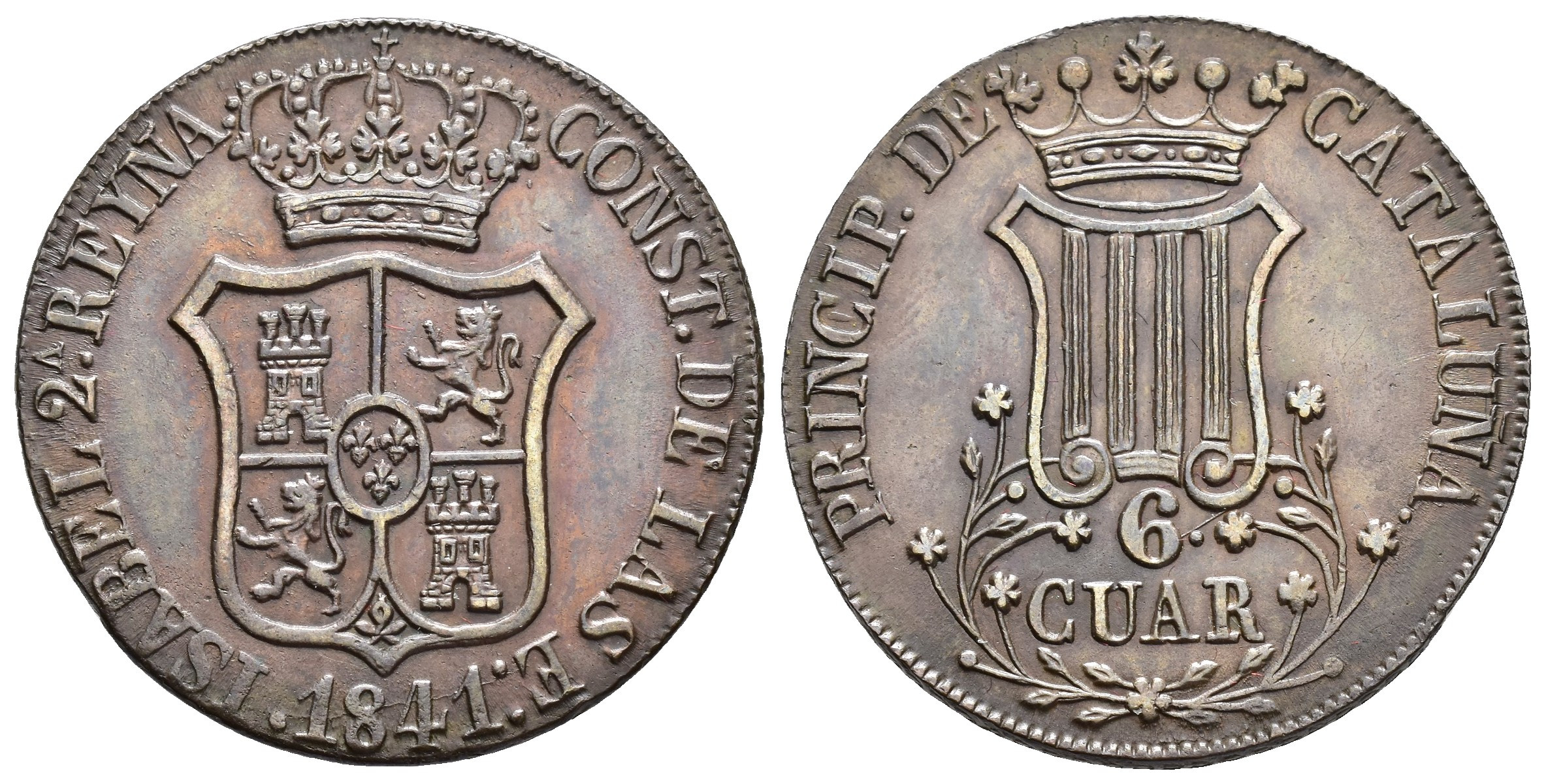 ISABEL II. 6 cuartos. 1841. Cataluña. Flores de 5 pétalos. CU 13,32 g. 31,9 mm. VI-229; AC-22. EBC-.