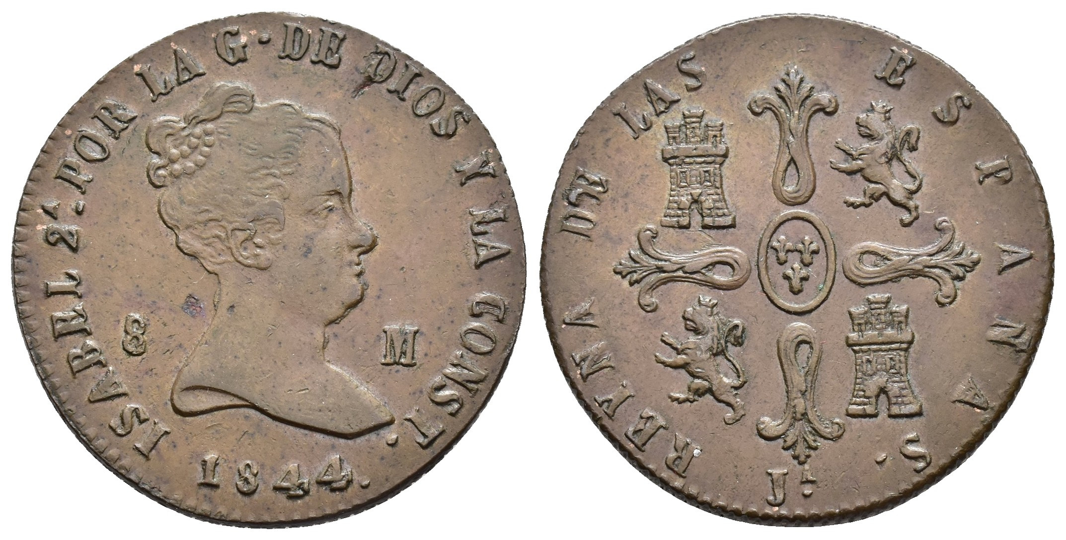 ISABEL II. 8 maravedís. 1844. Jubia. CU 10,6 g. 28,9 mm. VI-75; AC-111. Hojitas en anv. EBC-.