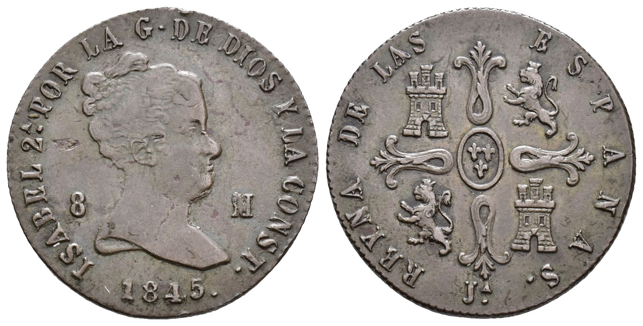 ISABEL II. 8 maravedís. 1845. Jubia. CU 9,66 g. 28,8 mm. VI-76; AC-112. Hojitas en anv. MBC/MBC+.