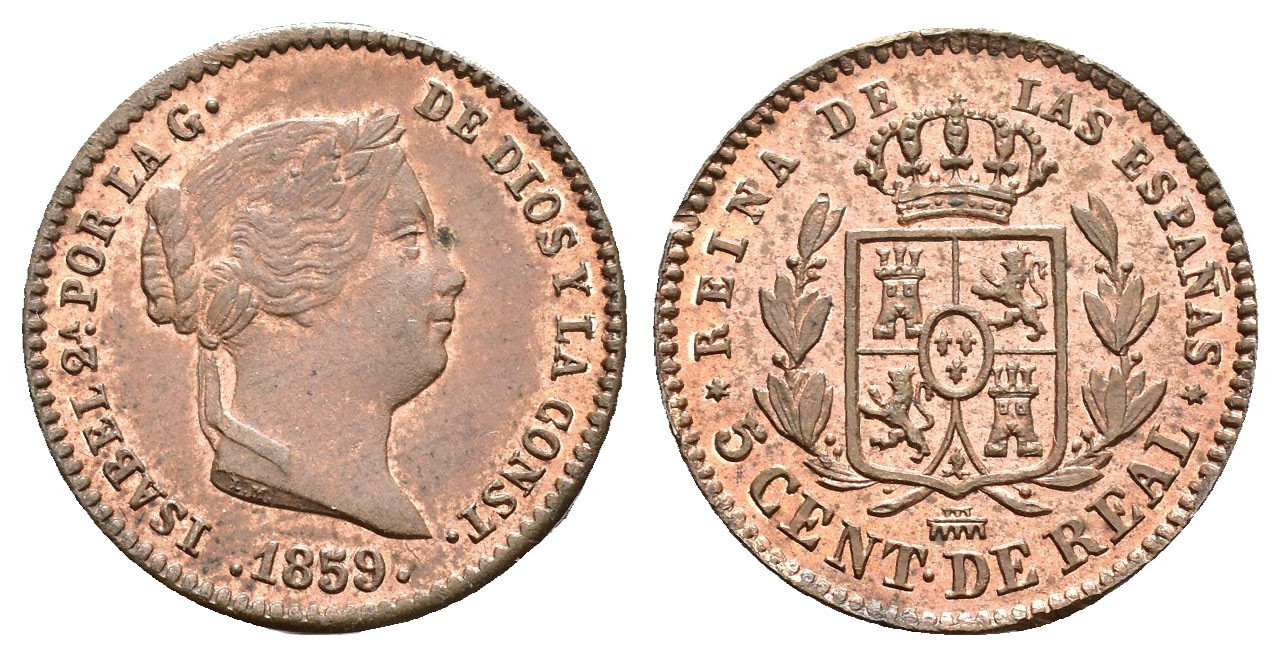 ISABEL II. 5 céntimos de real. 1859. Segovia. CU 1,8 g. 17,1 mm. VI-125; AC-164. B.O. EBC+.