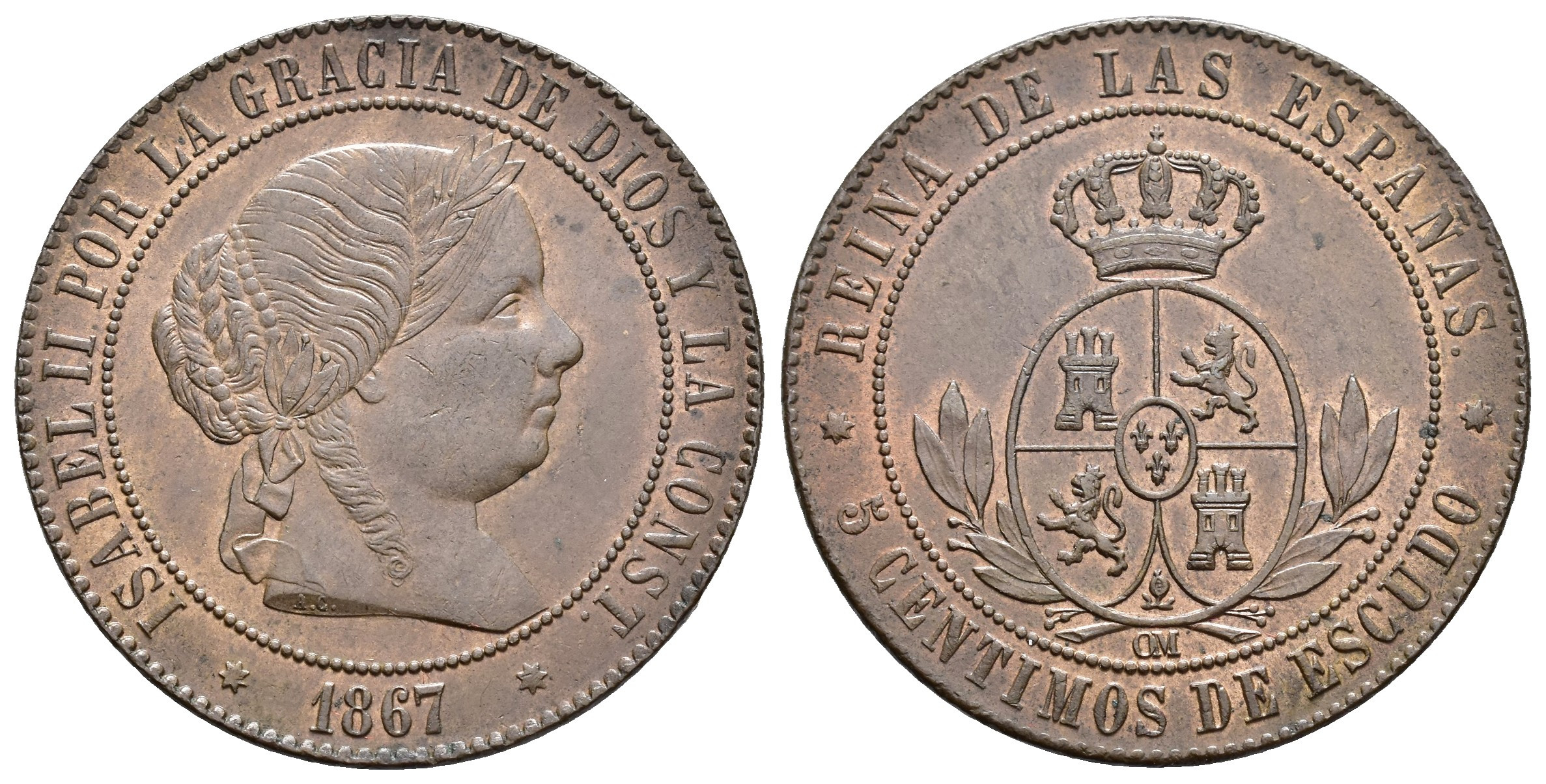 ISABEL II. 5 céntimos de escudo. 1867. Sevilla. OM. CU 12,83 g. 32,2 mm. VI-207; AC-261. Pequeñas marcas. R.B.O. EBC/EBC+.