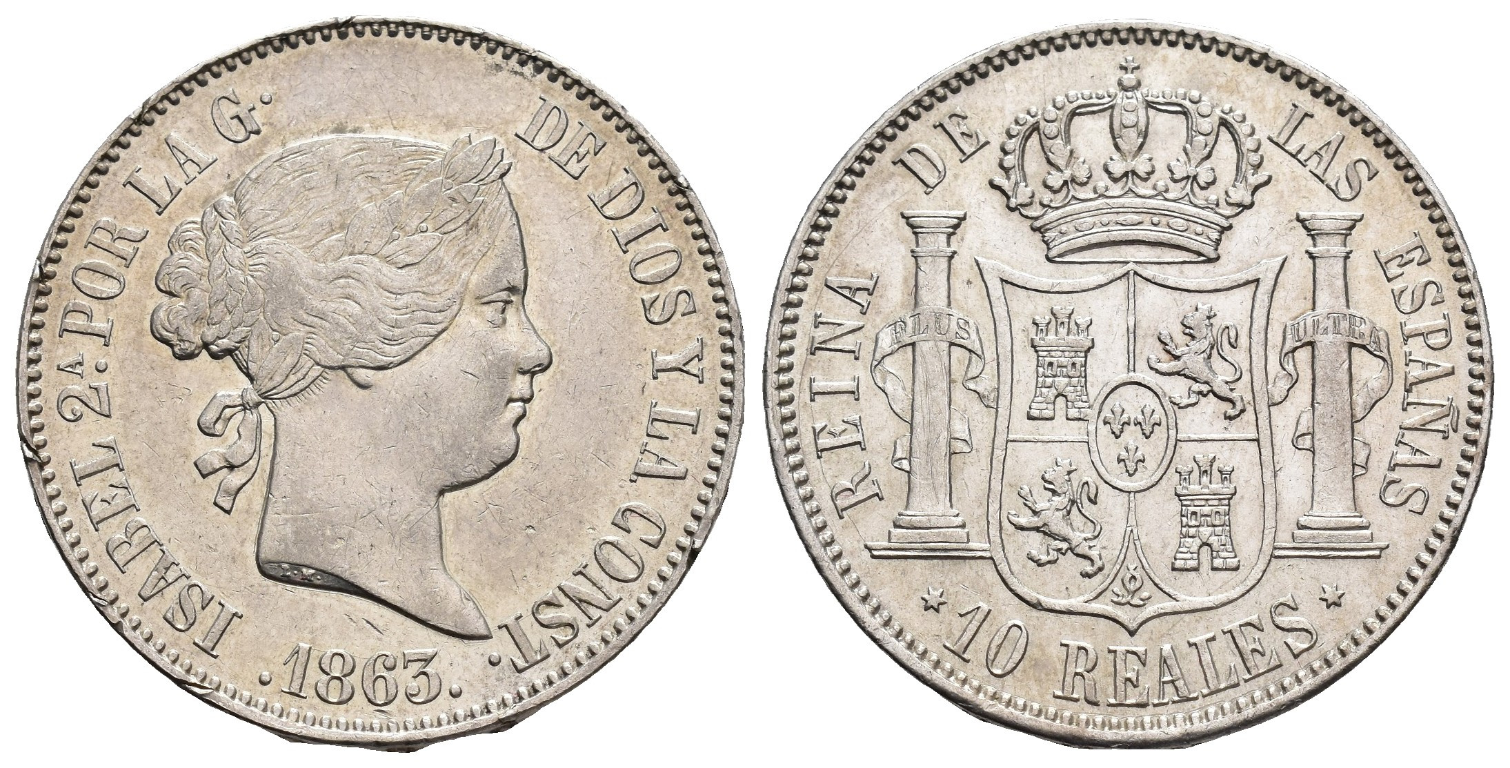 ISABEL II. 10 reales. 1863. Madrid. AR 12,99 g. 29,6 mm. VI-461; AC-540. Golpecitos en la gráfila del anv. EBC-.
