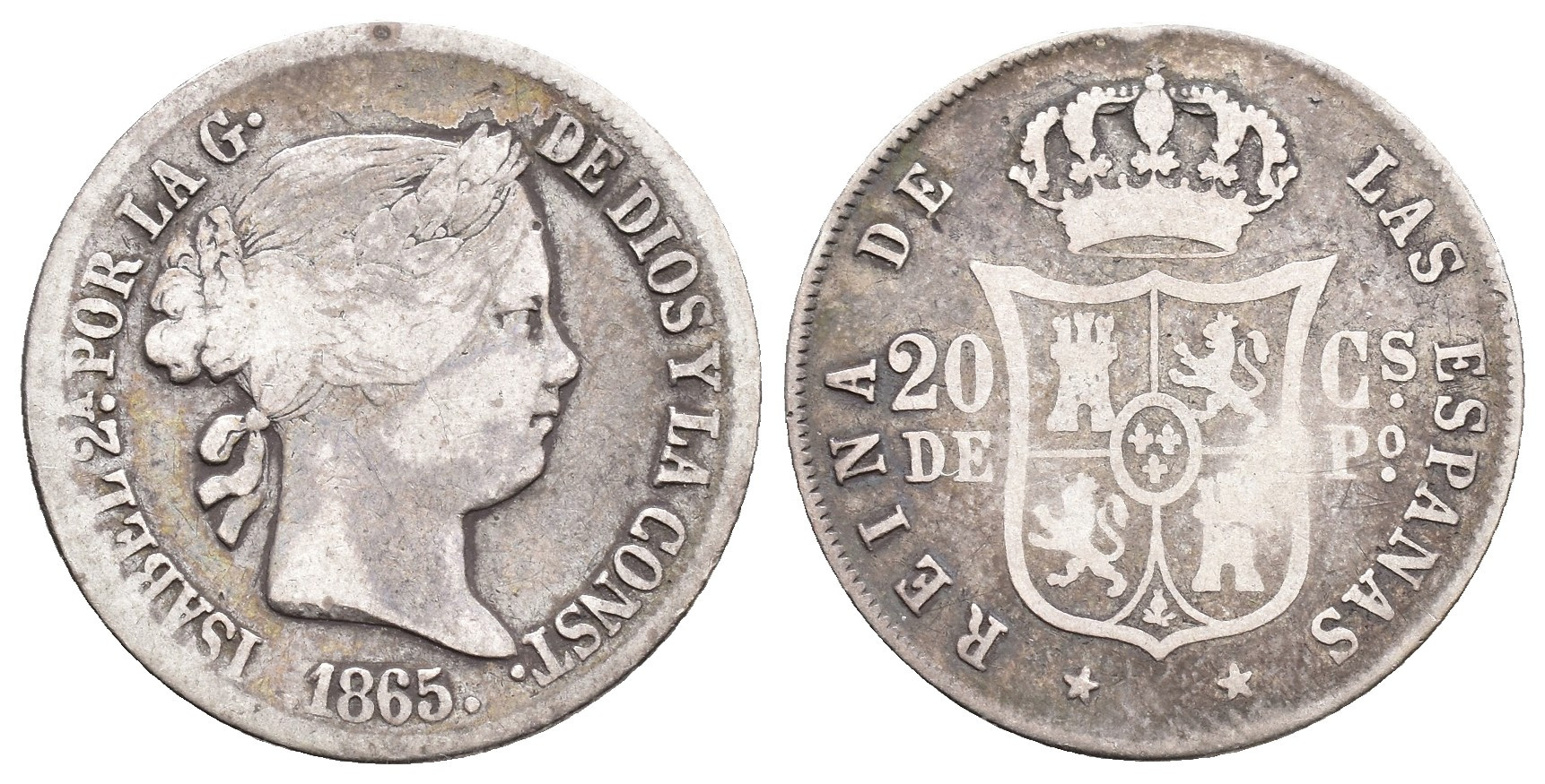 ISABEL II. 20 centavos de peso. 1865. Manila. AR 4,97 g. 23,3 mm. VI-548; AC-658. MBC-/BC+. Escasa.