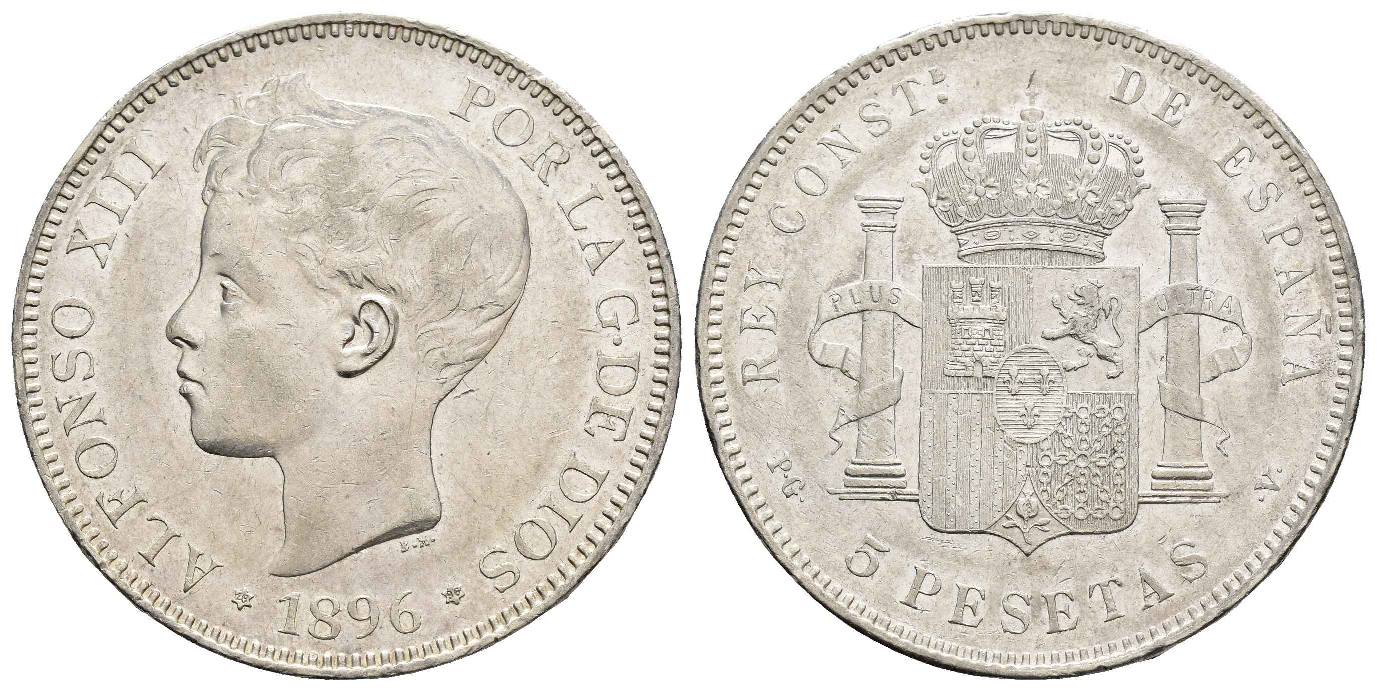 ALFONSO XIII. 5 pesetas. 1896*18-96. Madrid. PGV. AR 25,15 g. 37,4 mm. VII-188; AC-106. Pequeñas marcas. EBC-.