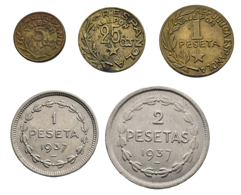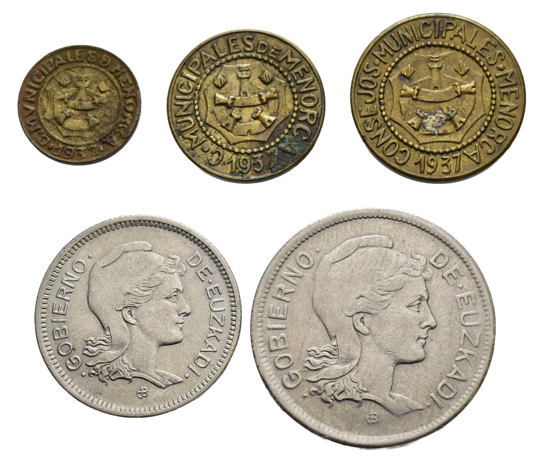 GUERRA CIVIL. Lote de 5 piezas: 5 y 25 cts. y 1 pta. Menorca y 1 y 2 pesetas Euzkadi. VII-250, 252, 253, 237 y 239. AC-20-24. MBC/EBC.