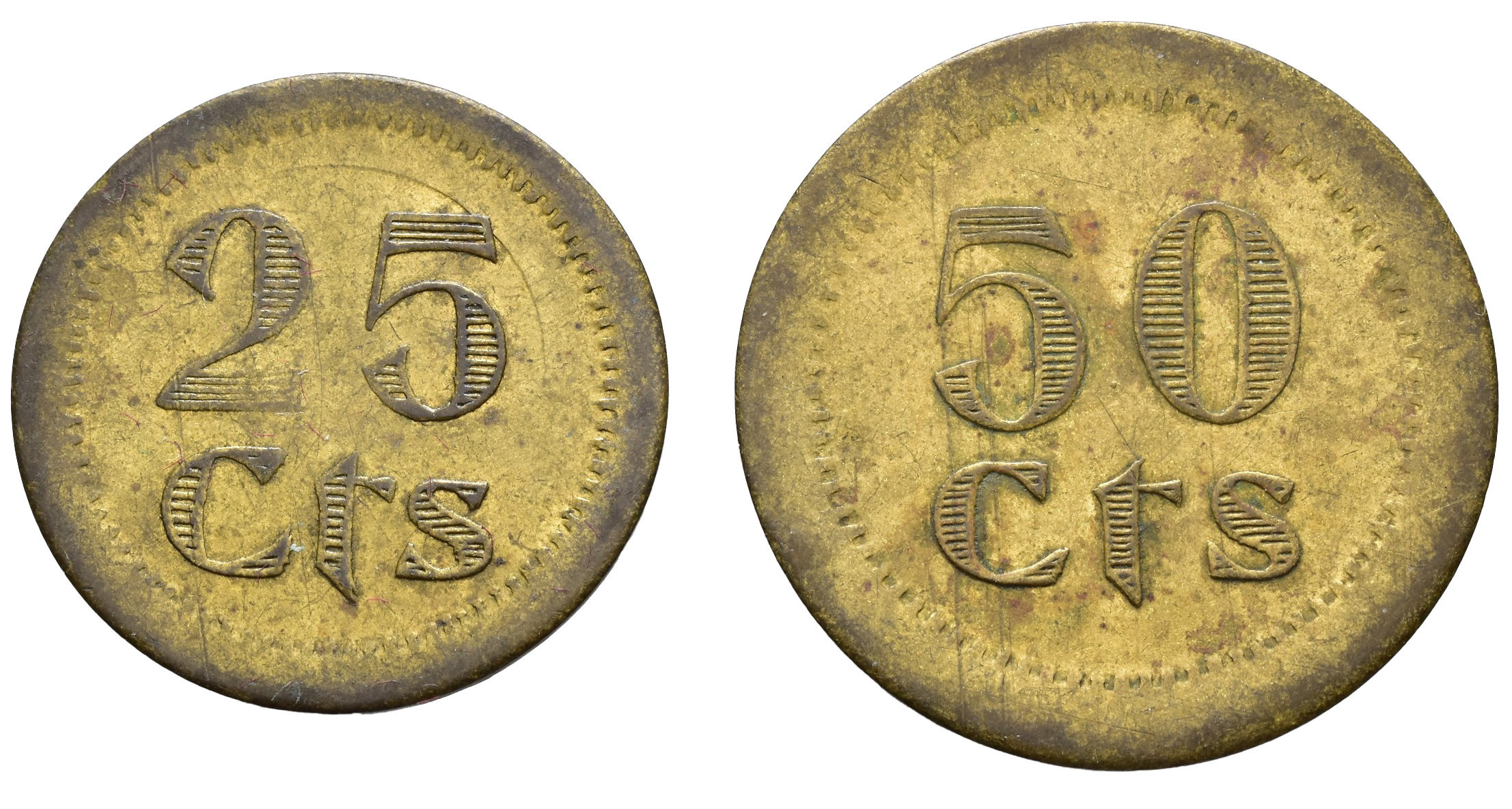 GUERRA CIVIL PUEBLA DE CAZALLA. Lote de 2 piezas: 25 y 50 céntimos. S/F. Rev. sin acuñar. VII-no; AC-50 y 51. MBC.