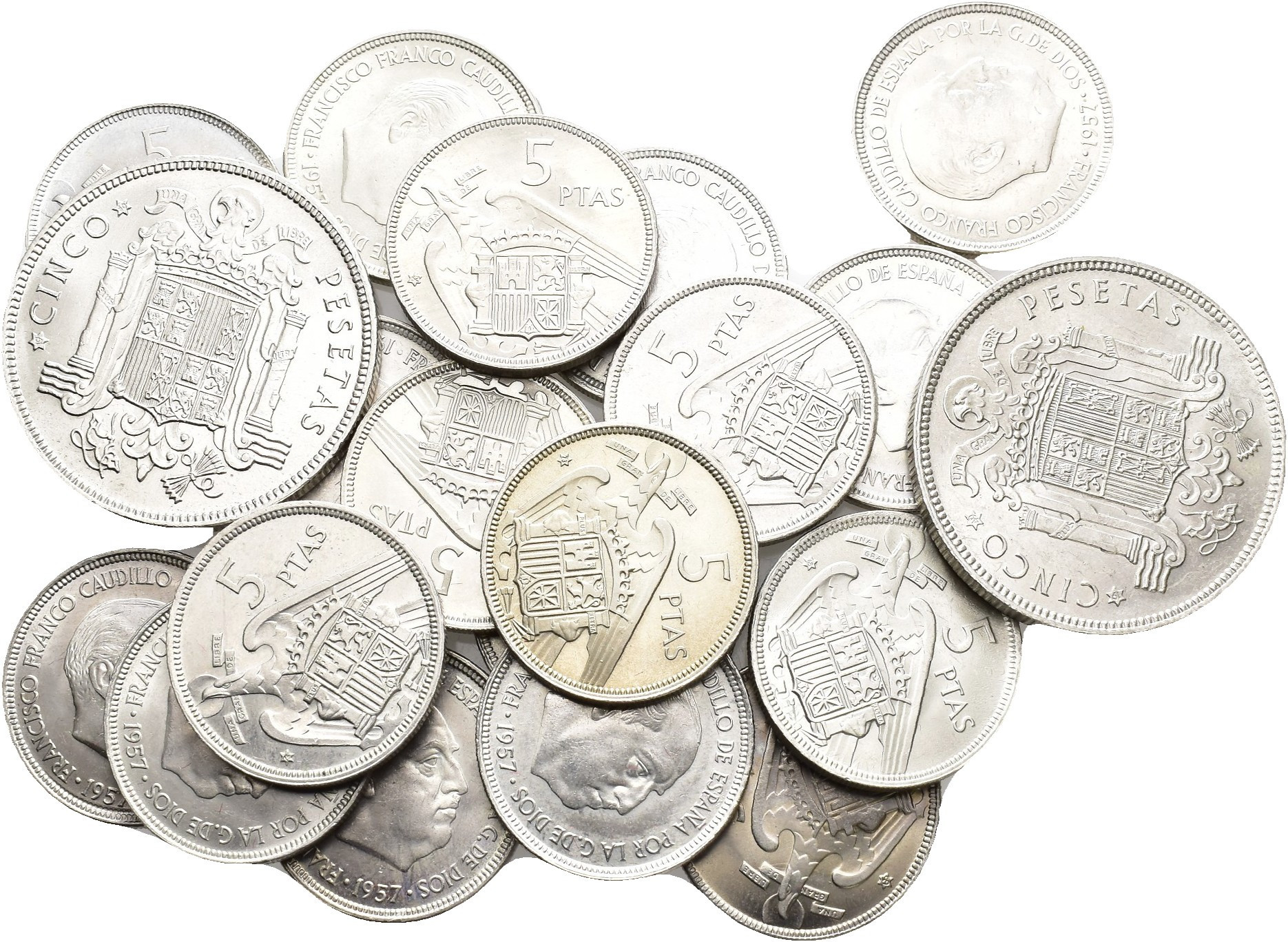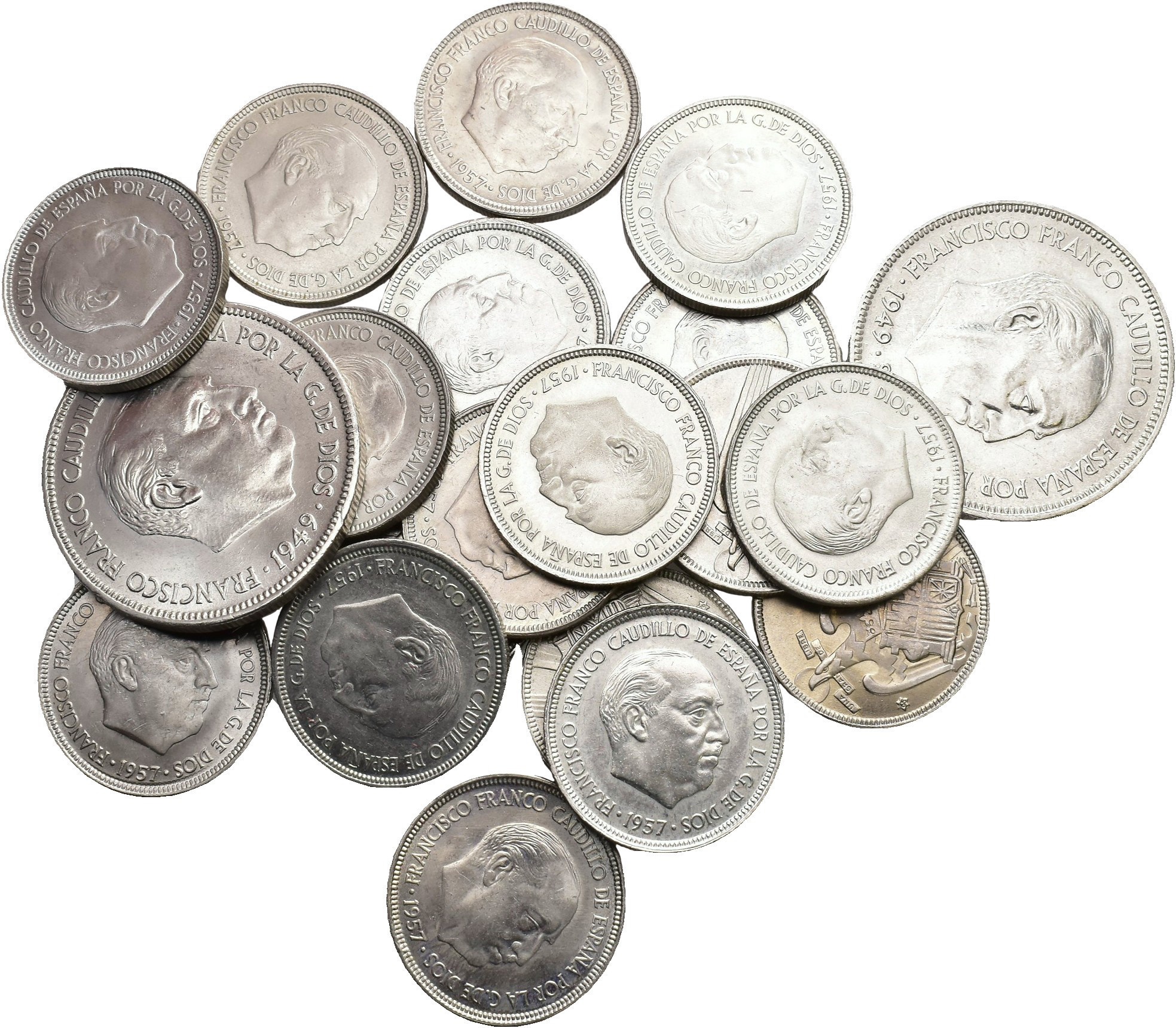 F. FRANCO. Lote de 20 piezas de 5 pesetas: 1949*1950 y 51 y 1957 (18 piezas) diferentes. EBC/SC.