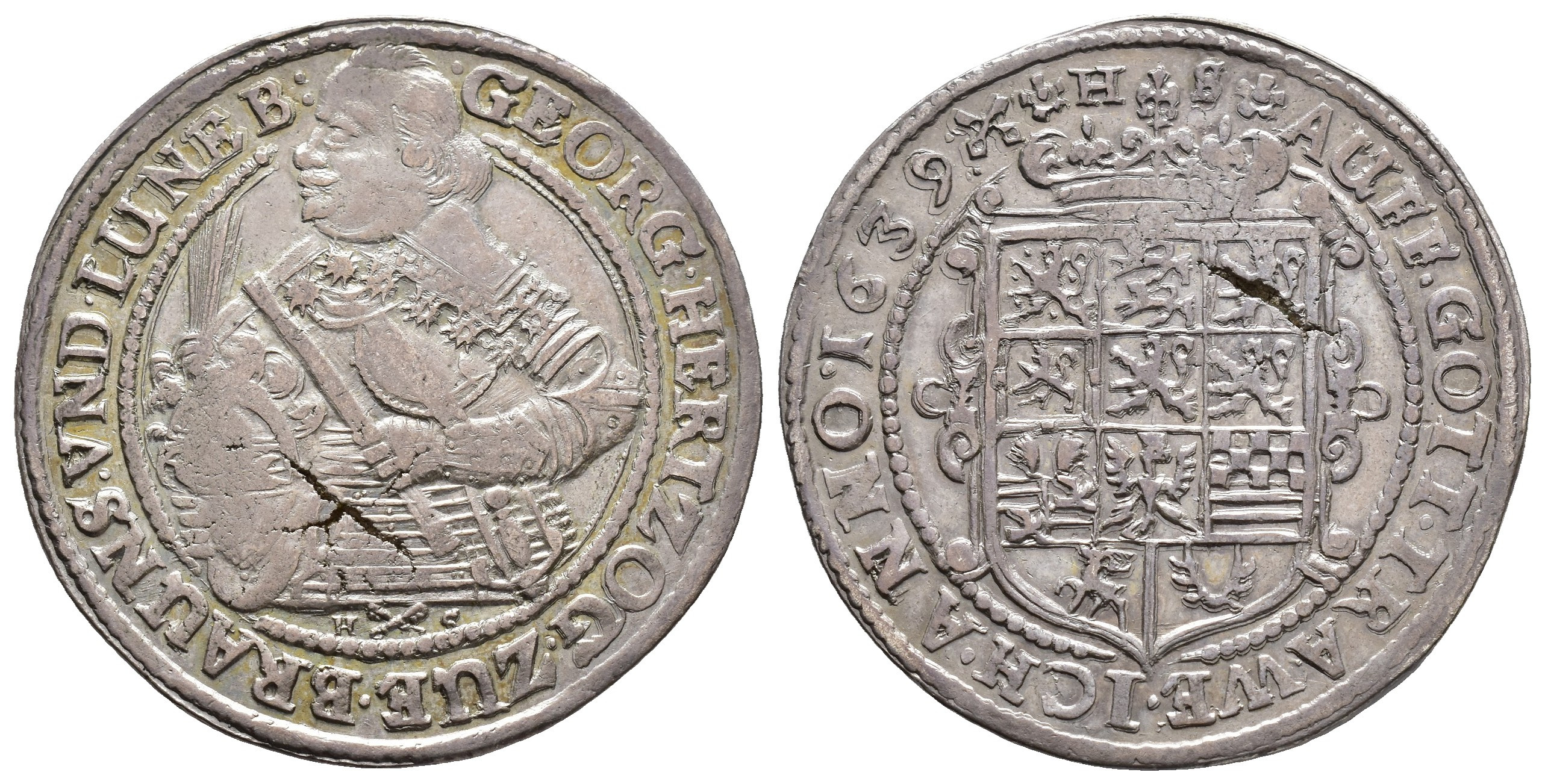 MONEDA EXTRANJERA. ALEMANIA Y ESTADOS ALEMANES. Brunswick-Wölfenbuttel. Jorge. 1/2 tálero. 1639. HS. AR 14,42 g. 35 mm. KM-19; Welter-1456. Grieta en anv. y rev. Plata agria. MBC+.