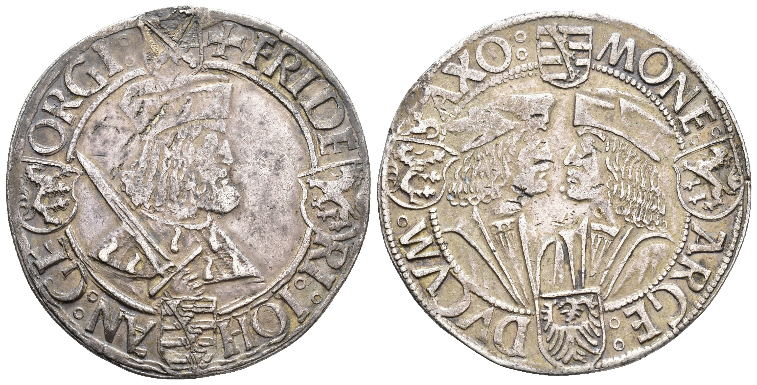 MONEDA EXTRANJERA. ALEMANIA Y ESTADOS ALEMANES. SAJONIA. Federico III, Juan y Jorge. Tálero. S.F. AR 29,16 g. 40,6 mm. Dav.-9709. Soldadura a las 12. Incisiones en anv. y rev. MBC.