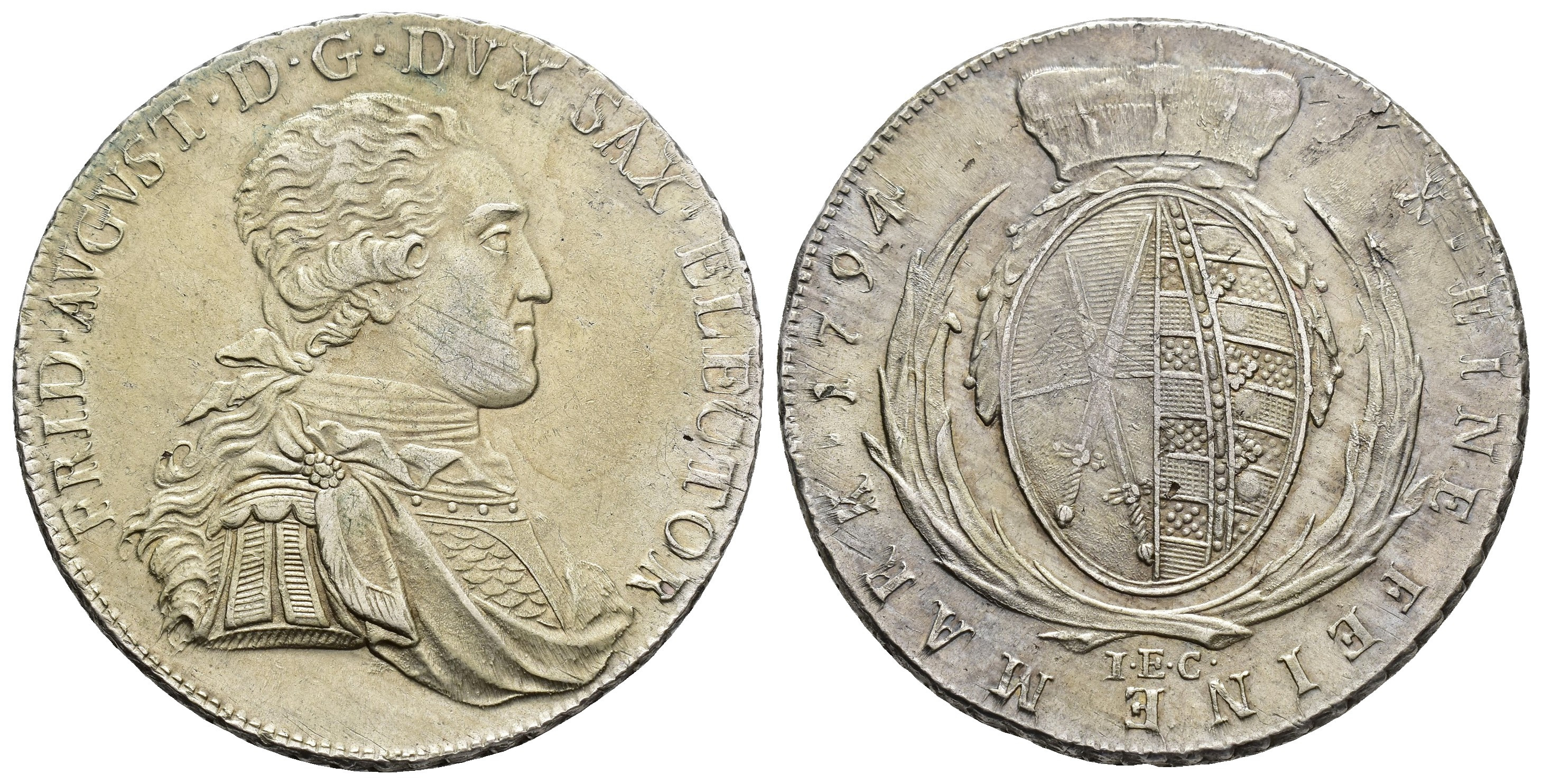 MONEDA EXTRANJERA. ALEMANIA Y ESTADOS ALEMANES. SAJONIA. Federico Augusto III. Tálero. 1793. I.E.C. AR 28,02 g. 39,9 mm. Dav.-2701; KM-1027.2. Rayitas de ajuste en anv. y pequeña hoja en rev. EBC-/MBC+.
