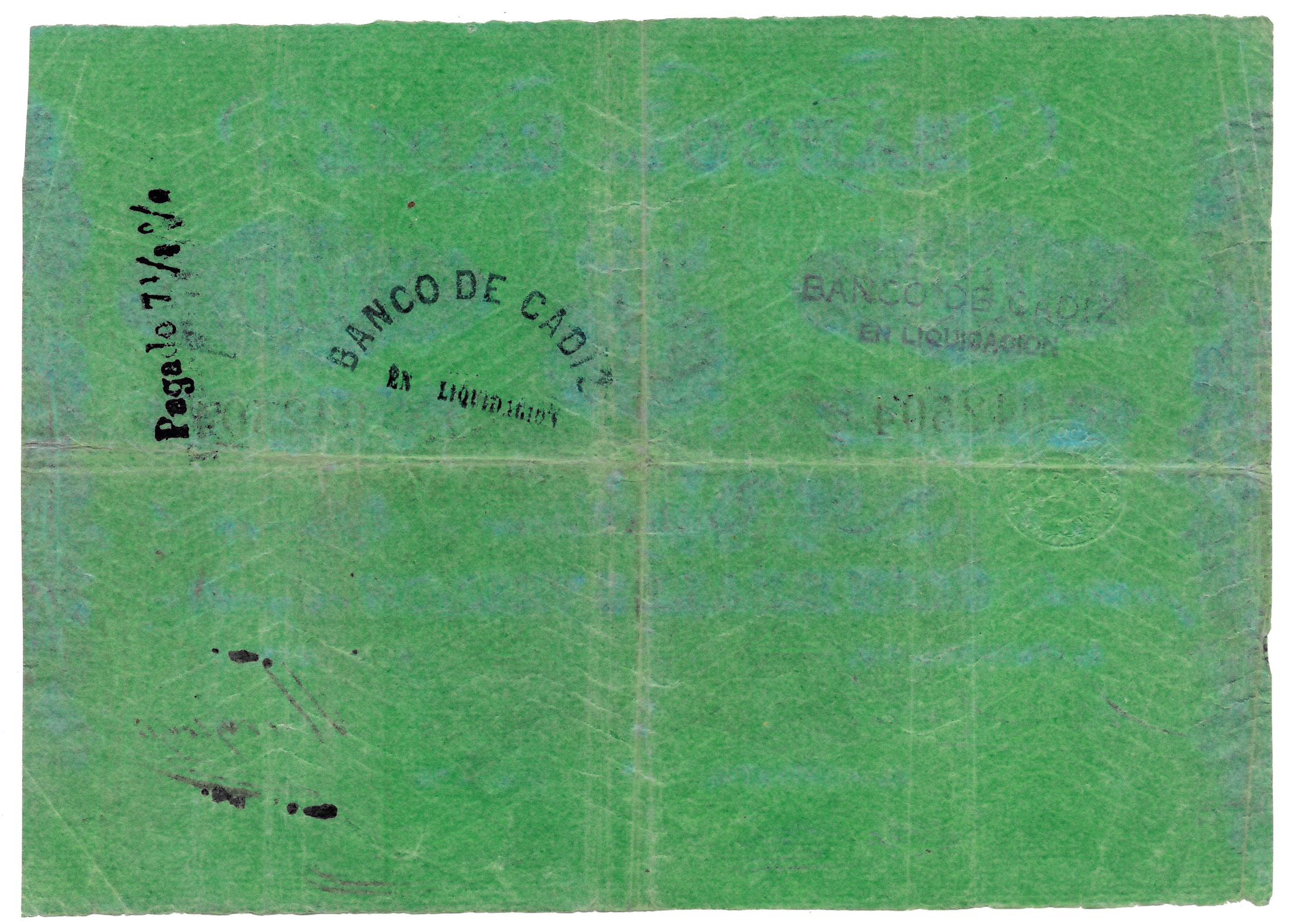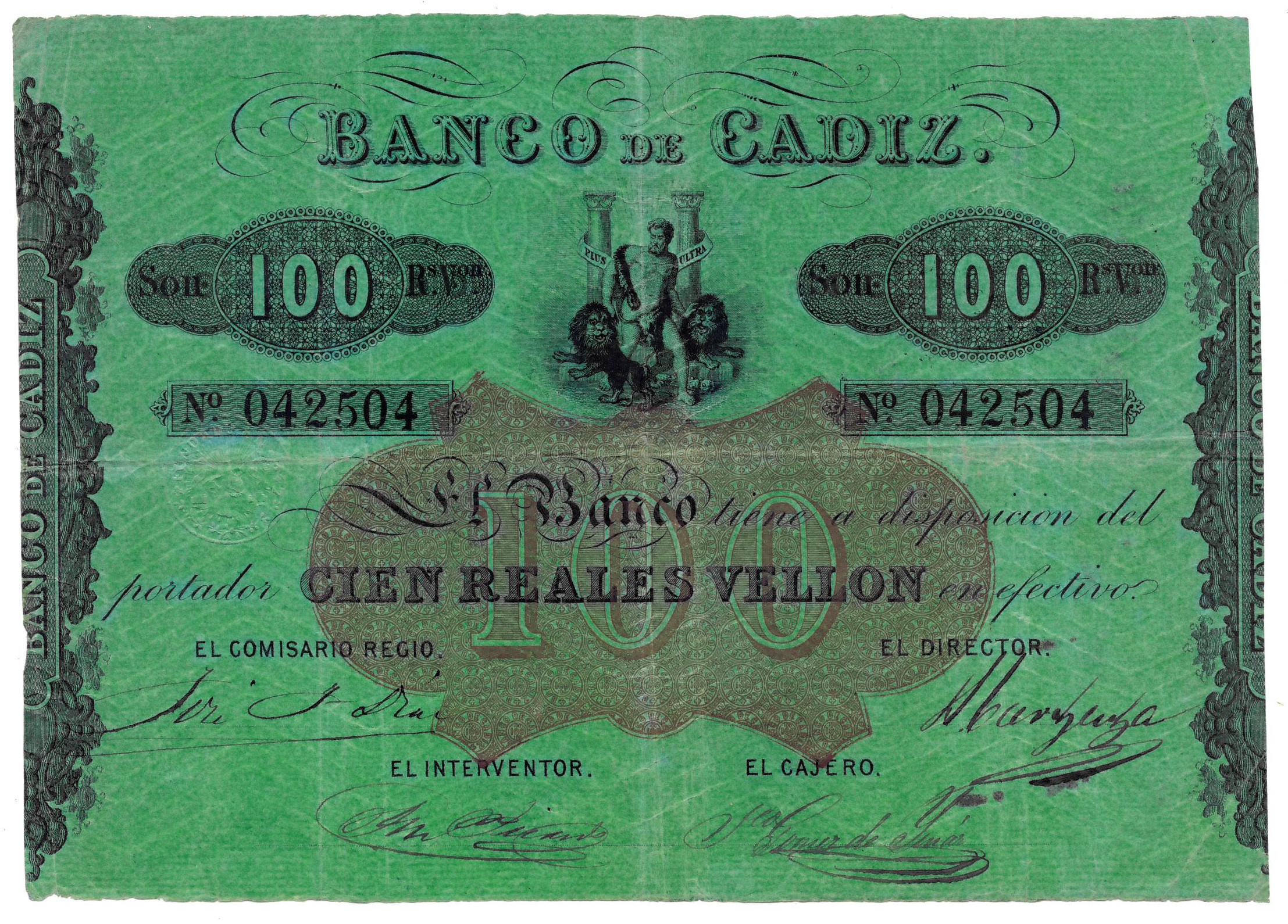 BILLETES ESPAÑOLES. BANCO DE CÁDIZ. 100 reales, Sin fecha, Sin serie, ED-78. Emisión III. Sello seco en MBC. Agujero central incipiente. BC+.