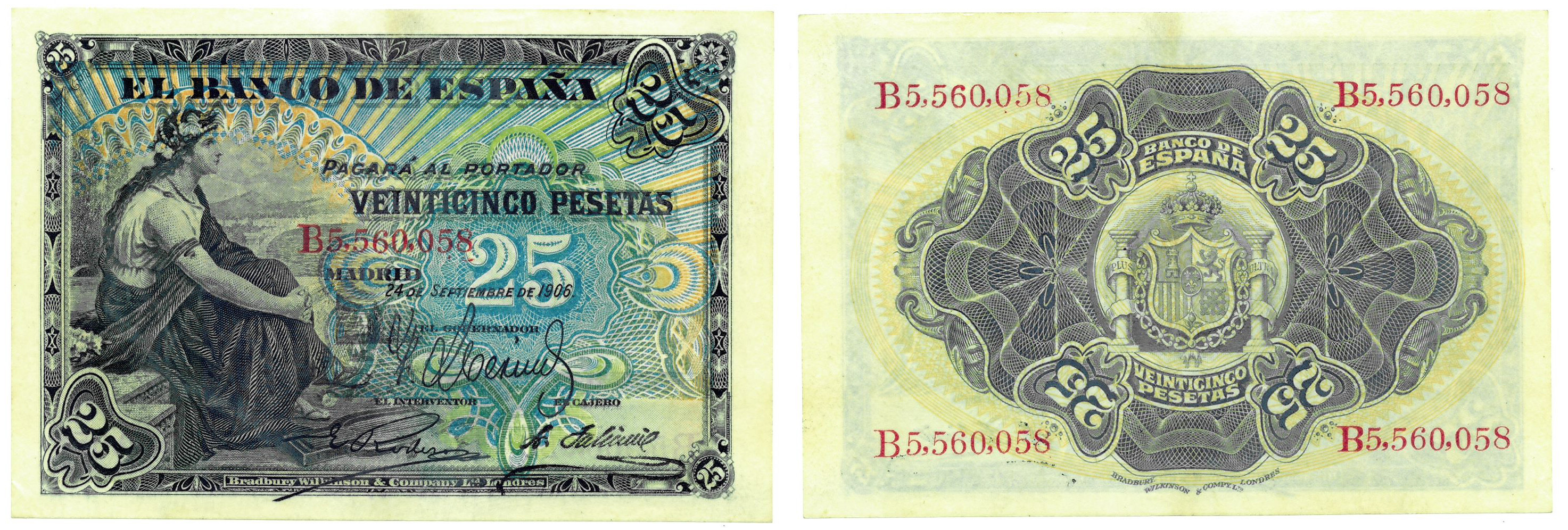 BILLETES ESPAÑOLES. BANCO DE ESPAÑA. 25 pesetas, 24 de septiembre de 1906, Serie B, ED-314a. Doblez central, dos dobleces de esquina y alguno suave. Planchado. MBC+.