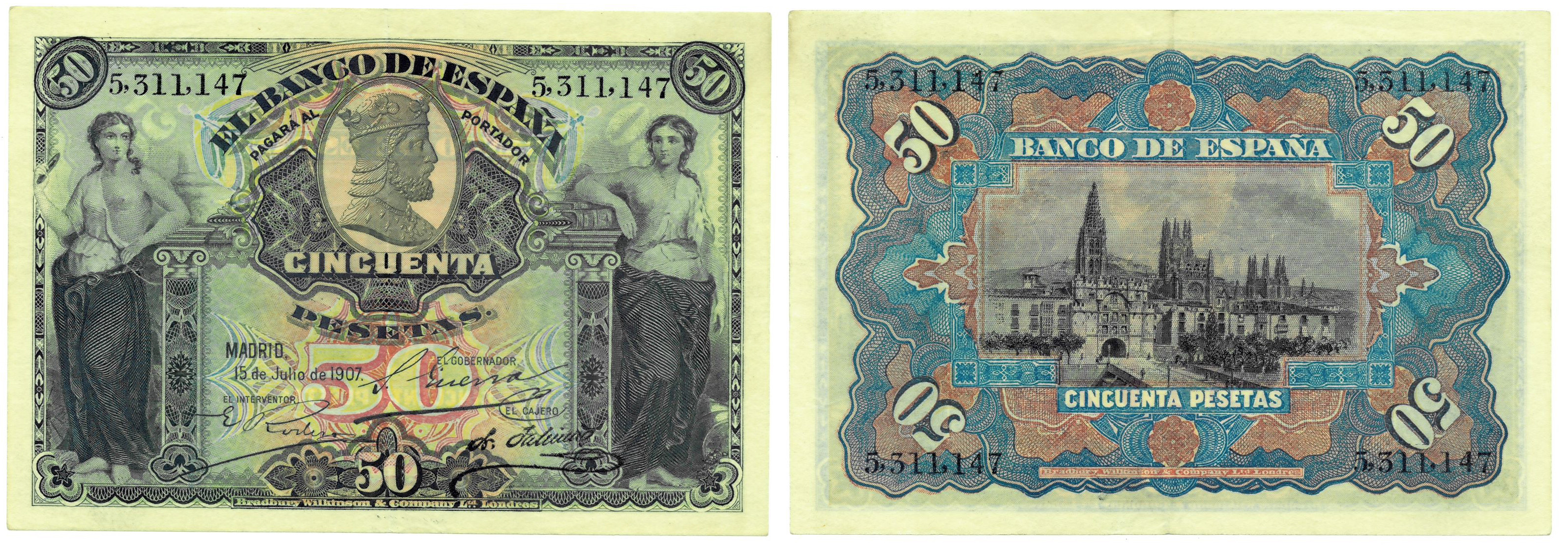 BILLETES ESPAÑOLES. BANCO DE ESPAÑA. 50 pesetas, 15 de julio de 1907, Sin serie, ED-319. Doblez central y doble suave en diagonal. Esquinas rozadas y bordes algo sucios. Planchado. EBC-.