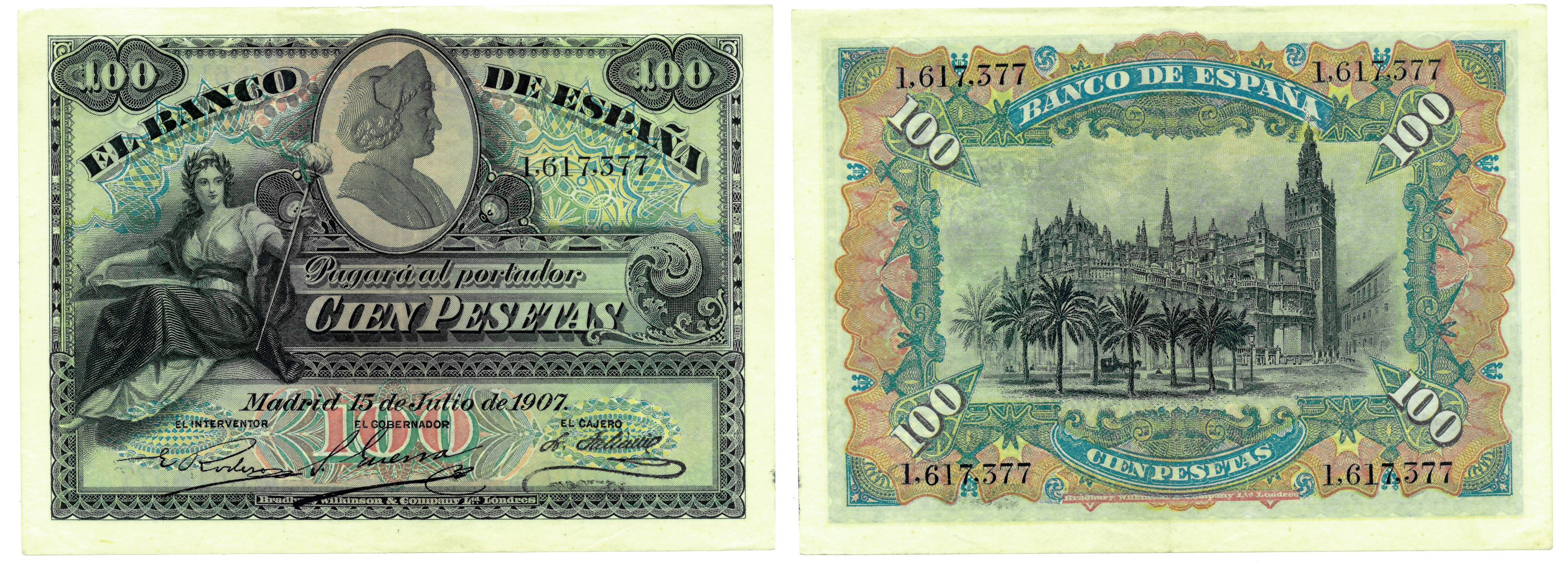 BILLETES ESPAÑOLES. BANCO DE ESPAÑA. 100 pesetas, 15 de julio de 1907, Sin serie, ED-320. Esquinas rozadas y bordes algo sucios. Pequeñas manchas. Planchado. EBC-.