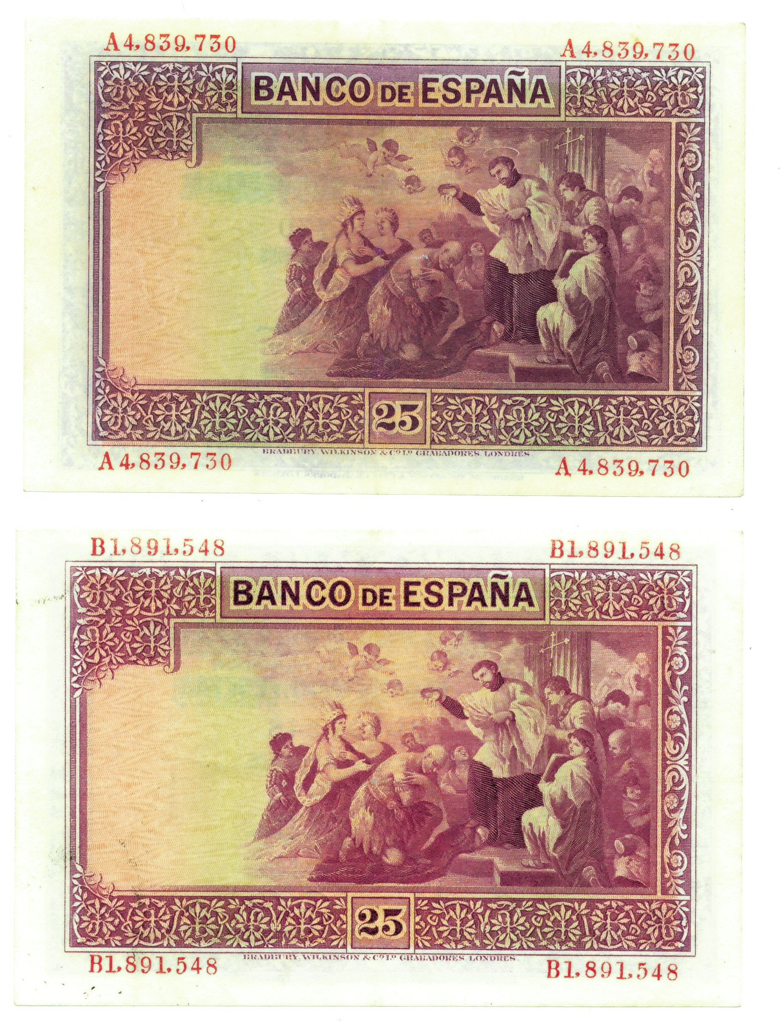 BILLETES ESPAÑOLES. BANCO DE ESPAÑA. Lote de 2 billetes. 25 pesetas, 12 de octubre de 1926, Serie A y Serie B, ED-325a. Prensados. El Serie A, EBC+, el Serie B, MBC+.
