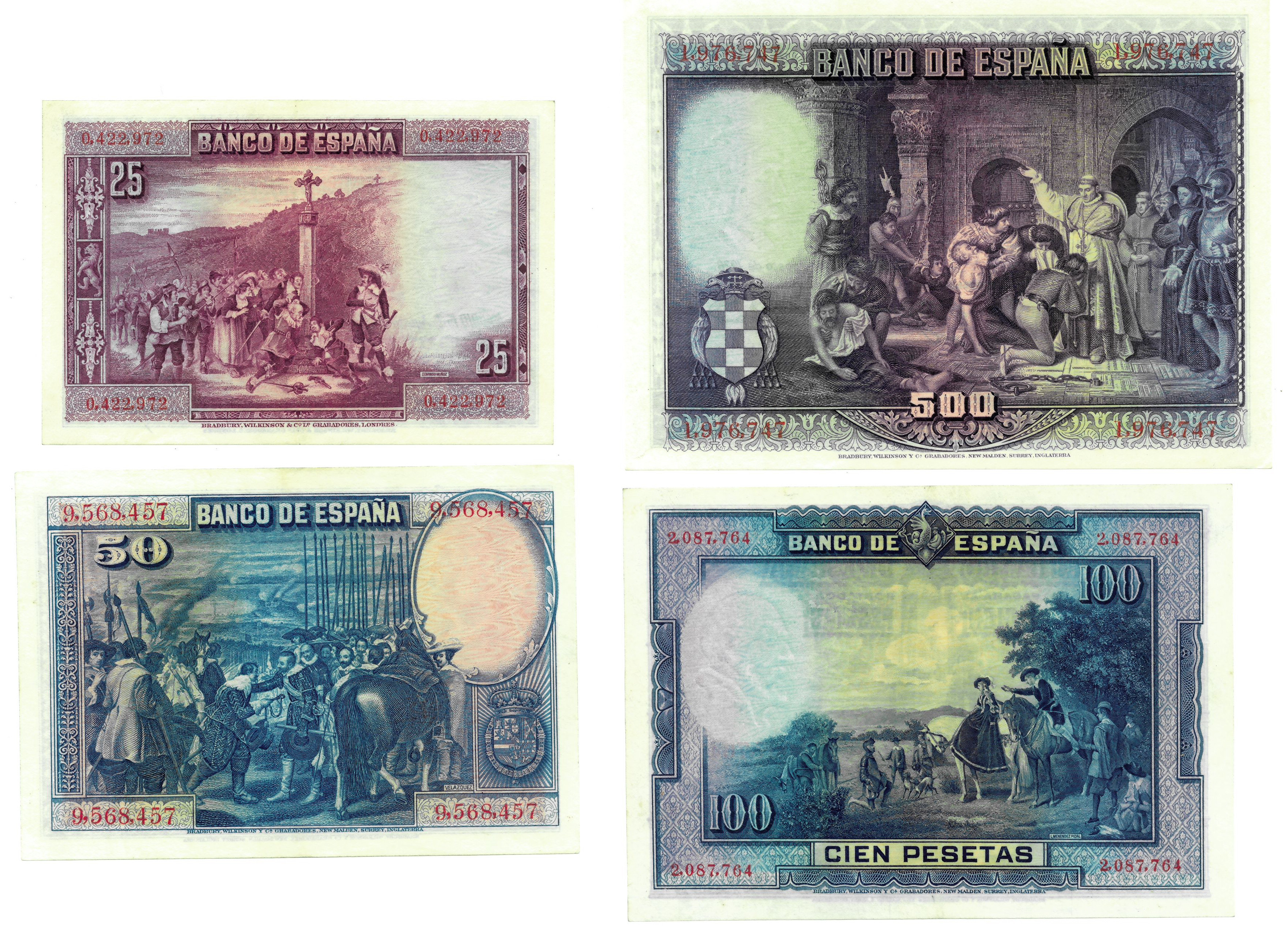 BILLETES ESPAÑOLES. BANCO DE ESPAÑA. Lote de 4 billetes. 25 pesetas (EBC+), 50 pesetas (EBC), 100 pesetas (EBC+) y 500 pesetas (SC-), 15 de agosto de 1928. Buenos relieves tipográficos en el de 500 pesetas. EBC a SC-.
