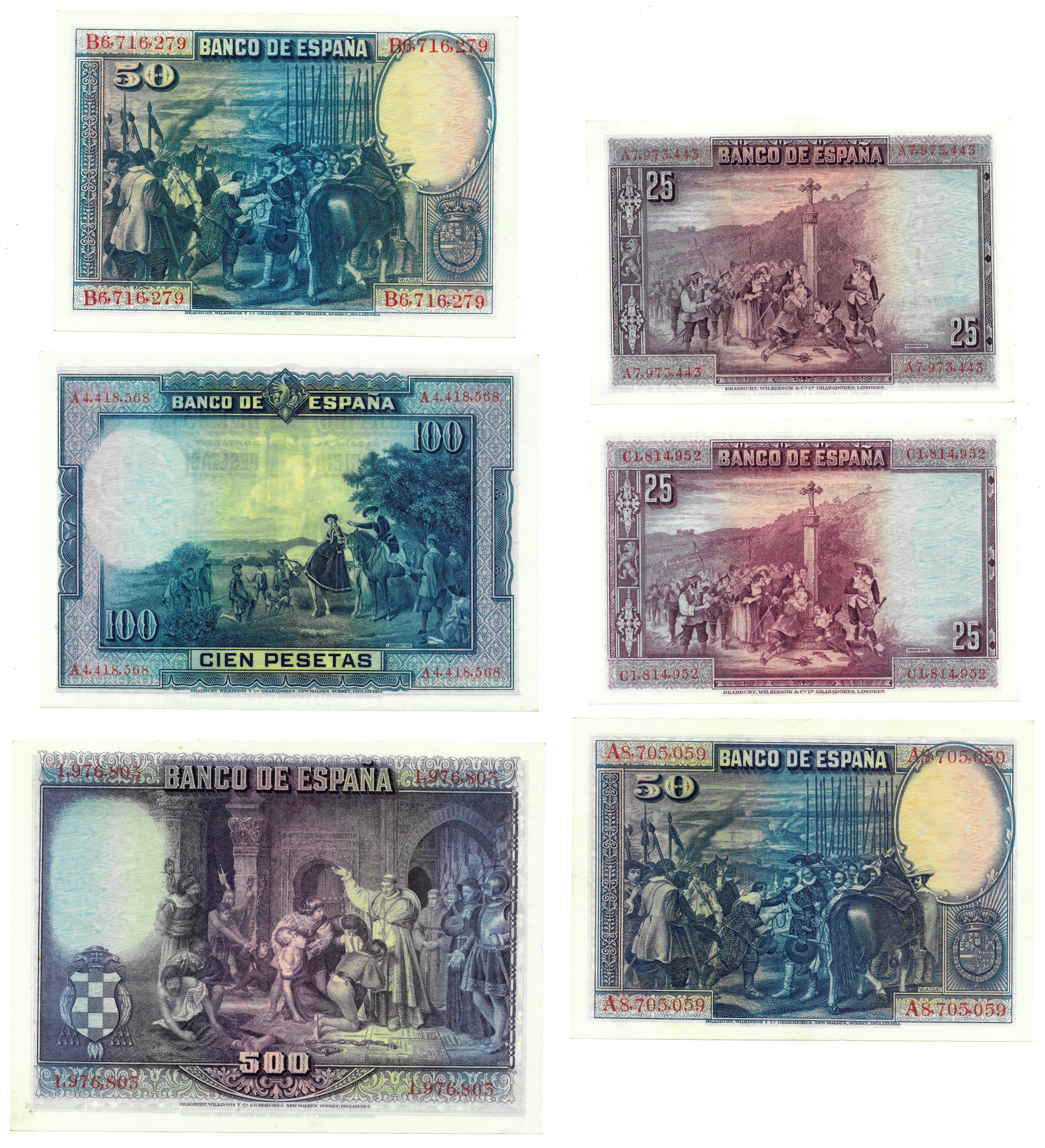 BILLETES ESPAÑOLES. BANCO DE ESPAÑA. Lote de 6 billetes. 25 pesetas (Serie A, EBC+; Serie C, SC); 50 pesetas (Serie A, MBC; Serie B, MBC), 100 pesetas (SC-), 500 (SC-). Buenos relieves tipográficos en los de 100 y 500 pesetas. MBC a SC-.