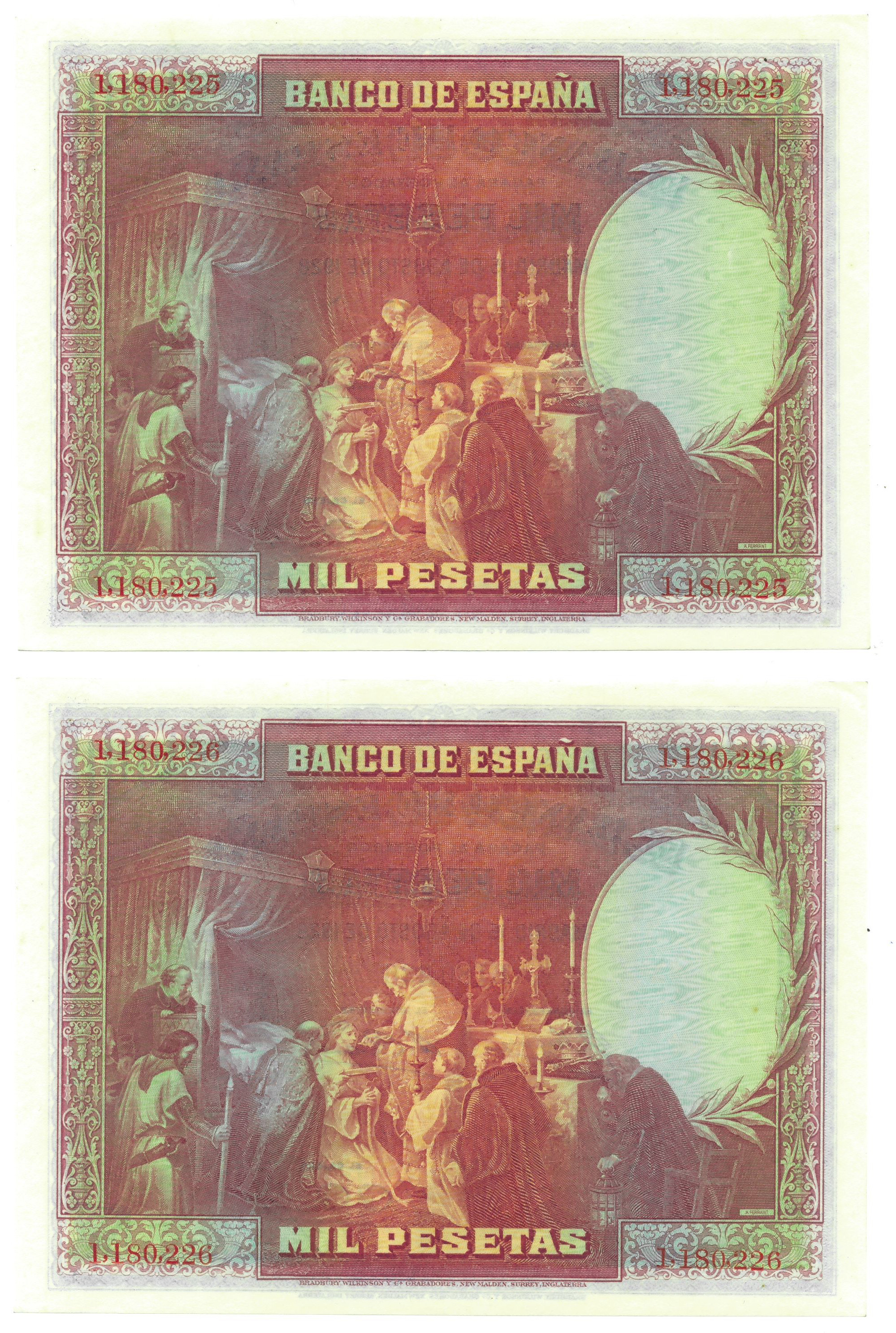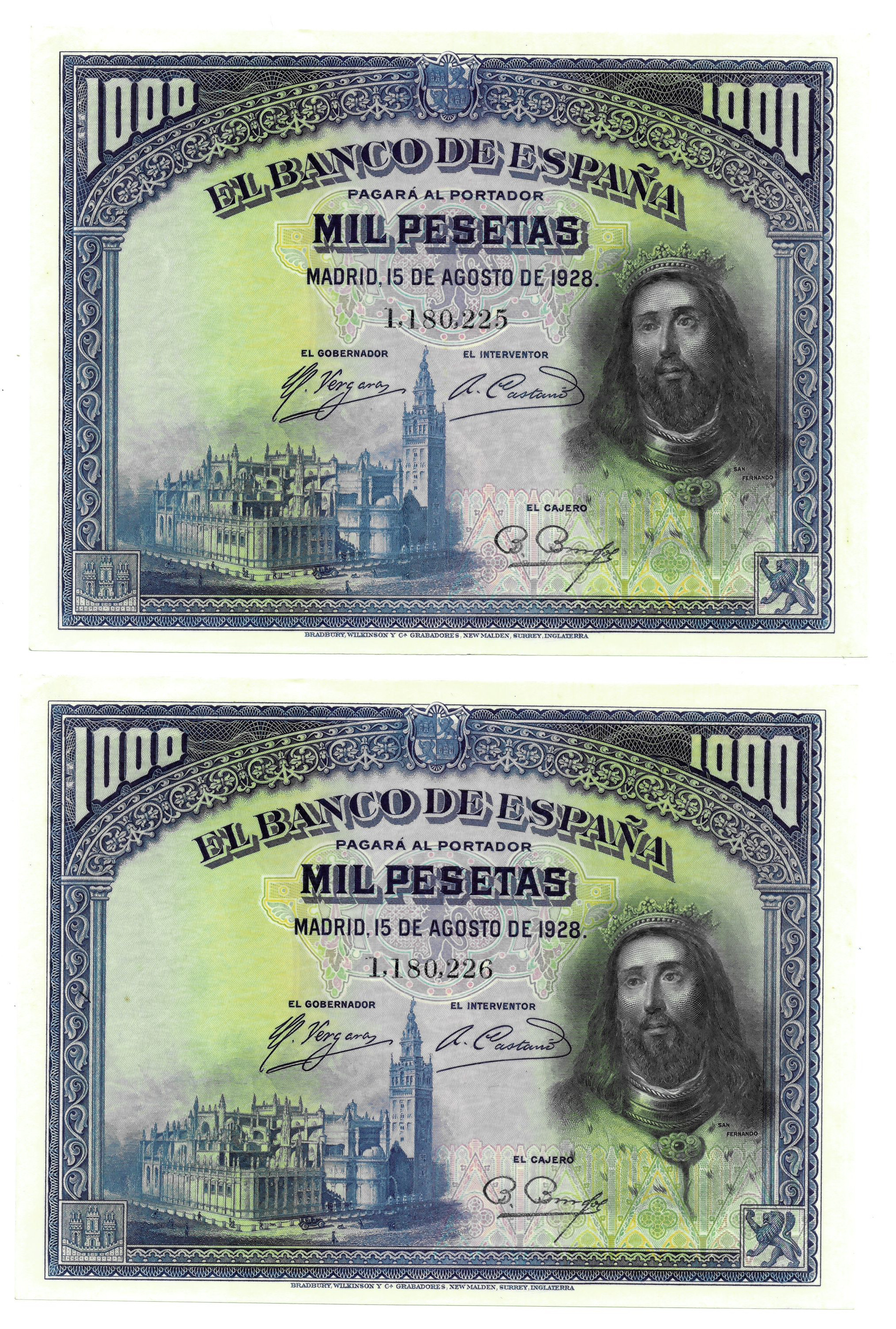 BILLETES ESPAÑOLES. BANCO DE ESPAÑA. Lote de 2 billetes. 1000 pesetas, 15 de agosto de 1928, Sin serie, ED-357. Pareja correlativa. Algunos bordes y esquinas mínimamente rozados. Mantiene todos los relieves. El terminado en 25 con un ligerísimo doblez en la esquina superior derecha. EBC+/SC-.