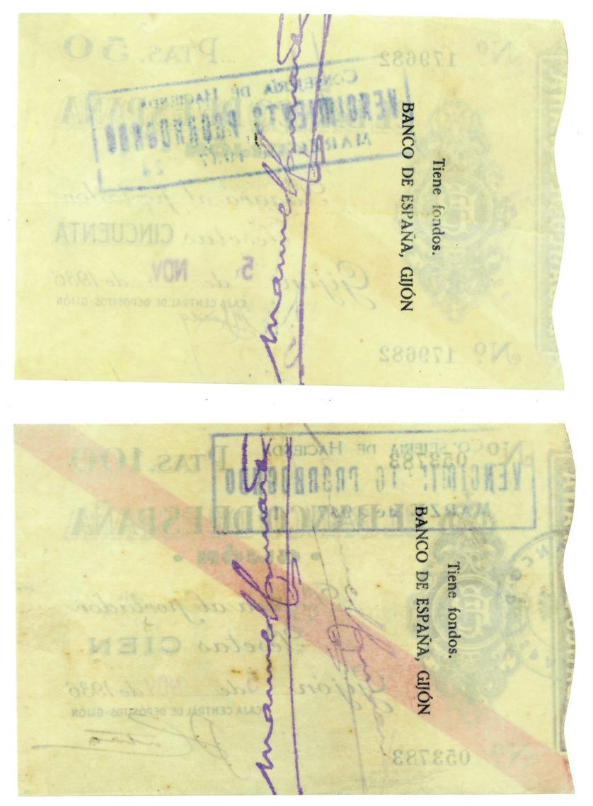 BILLETES ESPAÑOLES. BANCO DE ESPAÑA (GIJÓN). Lote de 2 billetes. 50 pesetas, 5 de noviembre de 1936, Sin serie, ED-383. Manchitas de óxido. Leve defecto de papel en borde inferior con zona con menor densidad. Planchado. MBC; 100 pesetas, 5 de noviembre de 1936, Sin serie, ED-384. Manchitas de óxido. Punto de aguja. Planchado. Doble estampillado de la firma de M. Camarero en reverso (una por transferencia de otro billete con tinta fresca). EBC.
