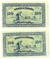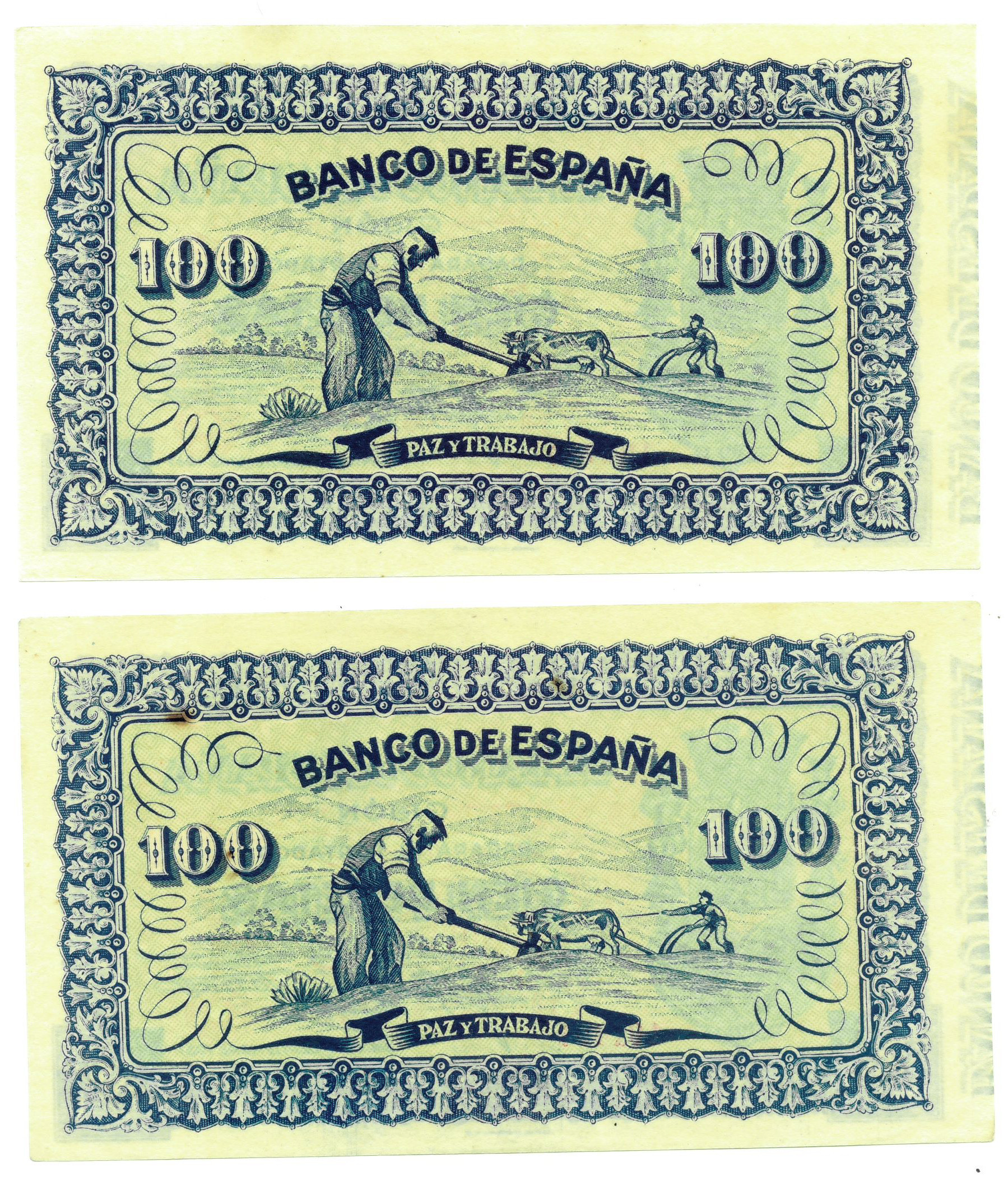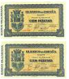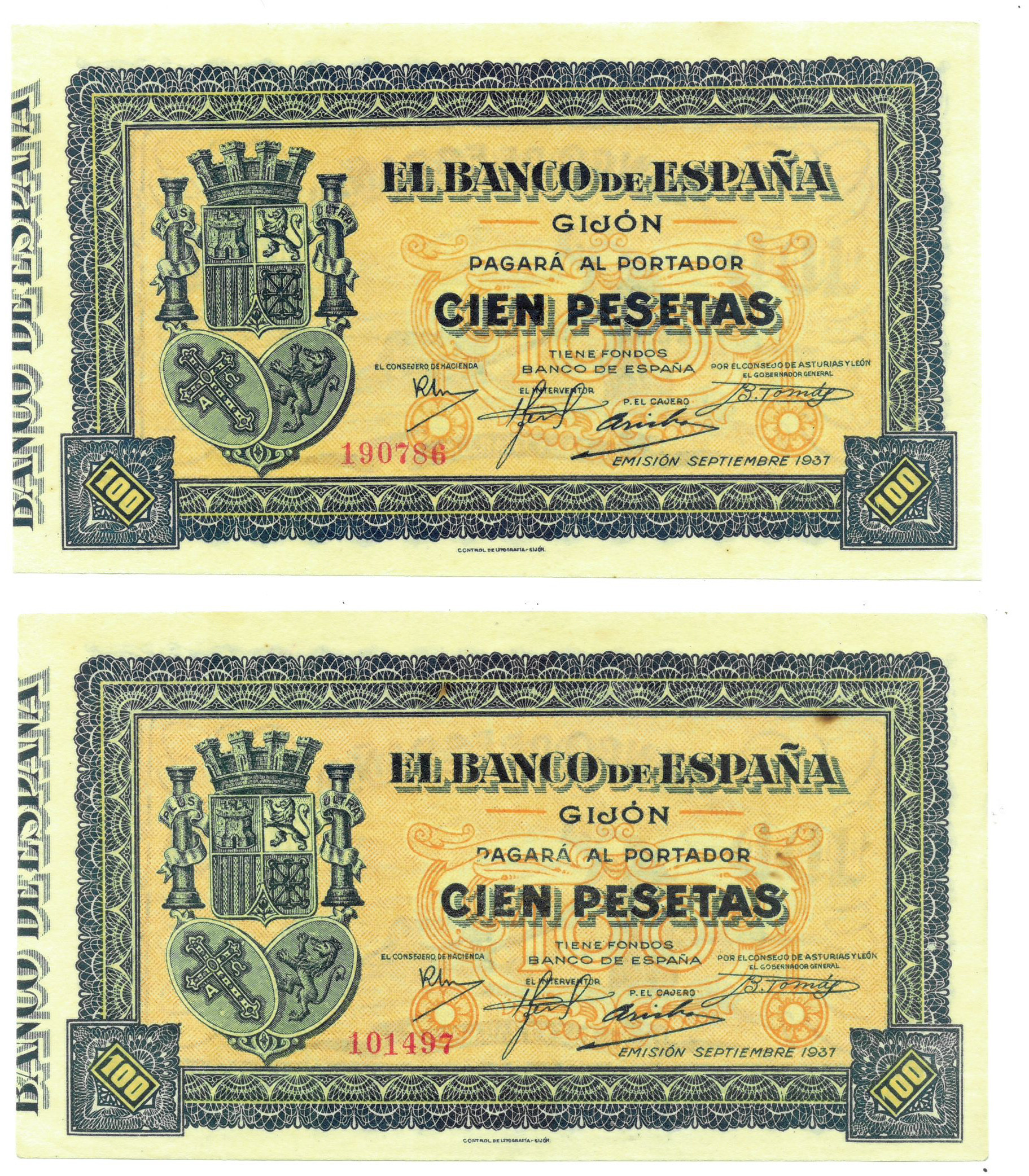 BILLETES ESPAÑOLES. BANCO DE ESPAÑA (GIJÓN). 100 pesetas, septiembre de 1937, Sin serie, ED-399. Lote de 2 billetes. Uno con manchas de óxido. SC.