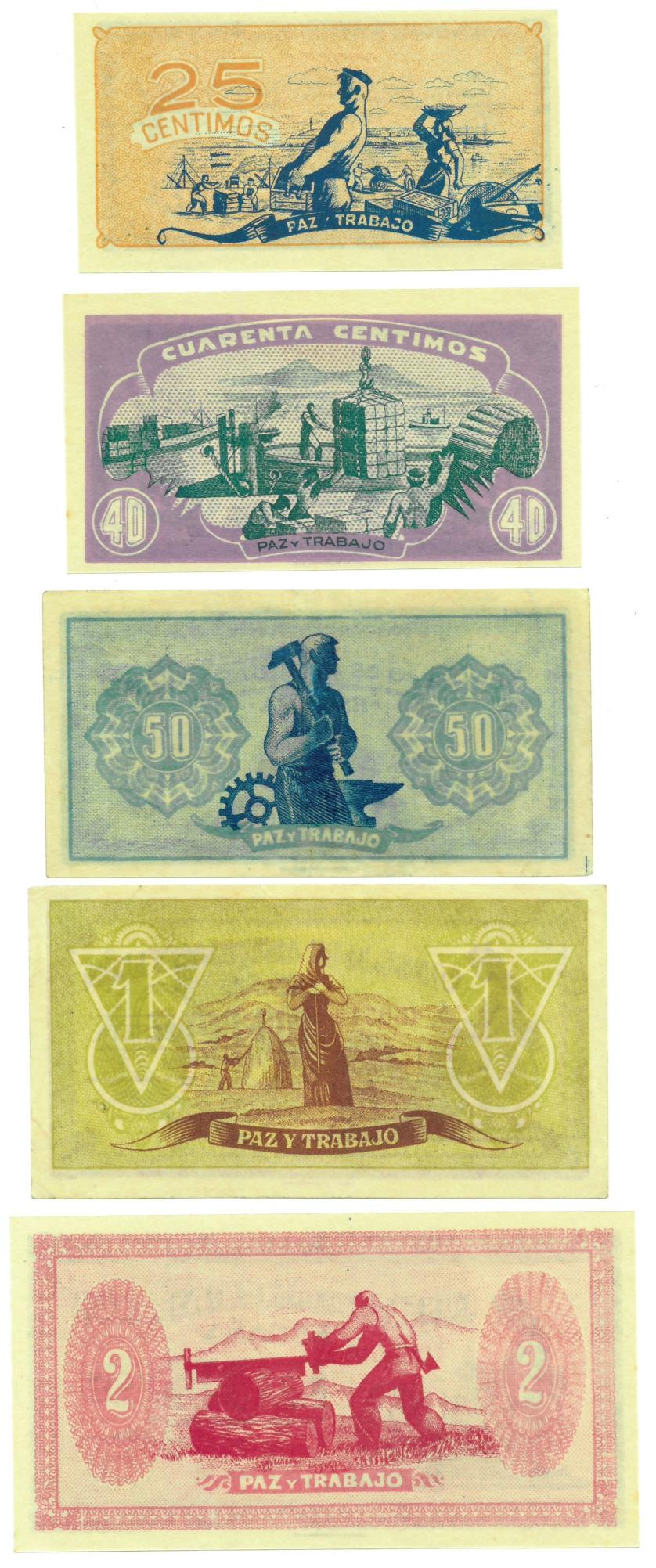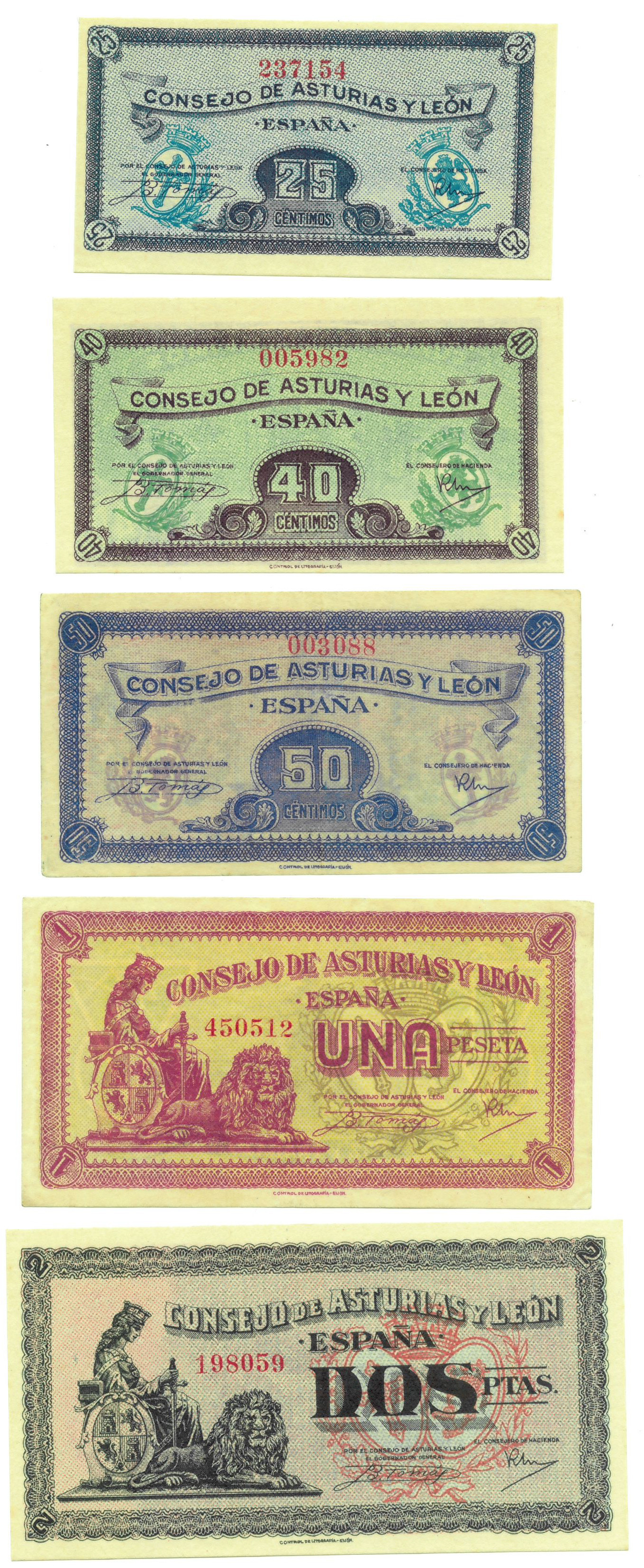 BILLETES ESPAÑOLES. CONSEJO DE ASTURIAS Y LEÓN. 25, 40 y 50 céntimos, 1 y 2 pesetas, 1937, Sin serie, ED-394/395/396/397/398. El de 50 céntimos en EBC. EBC a SC.