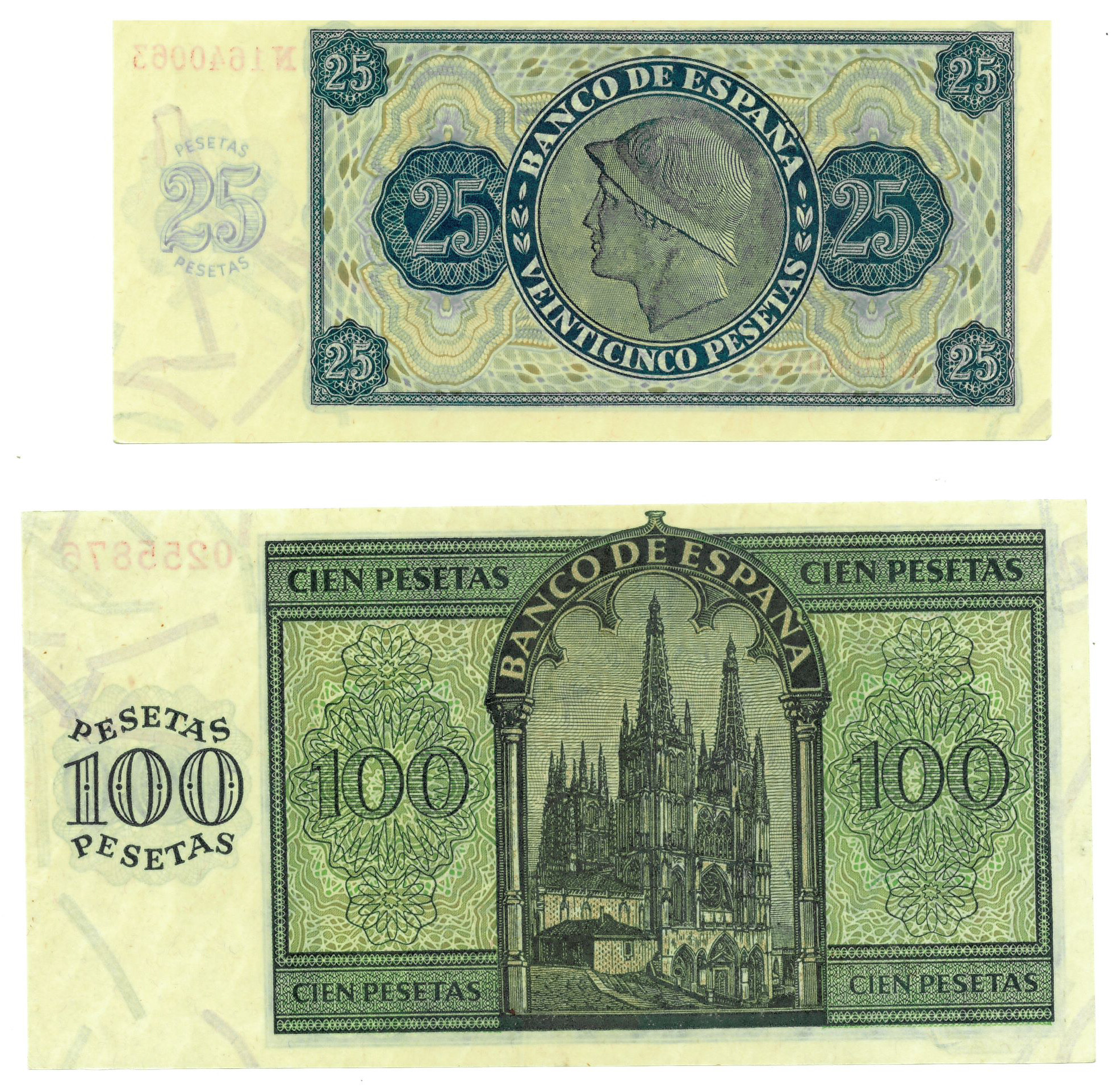 BILLETES ESPAÑOLES. BANCO DE ESPAÑA. Lote de 2 billetes. 25 pesetas, 21 de noviembre de 1936, Serie N, ED-419a; 100 pesetas, 21 de noviembre de 1936, Serie O, ED-421a. EBC+ a SC-.