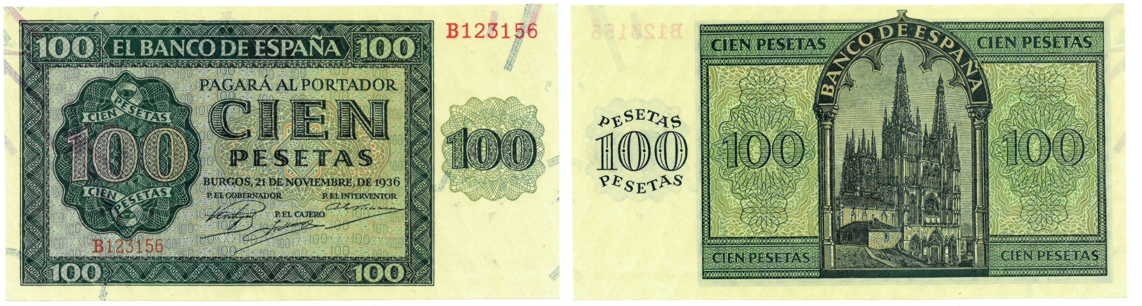 BILLETES ESPAÑOLES. BANCO DE ESPAÑA. 100 pesetas, 21 de noviembre de 1936, Serie B, ED-421a. SC-.