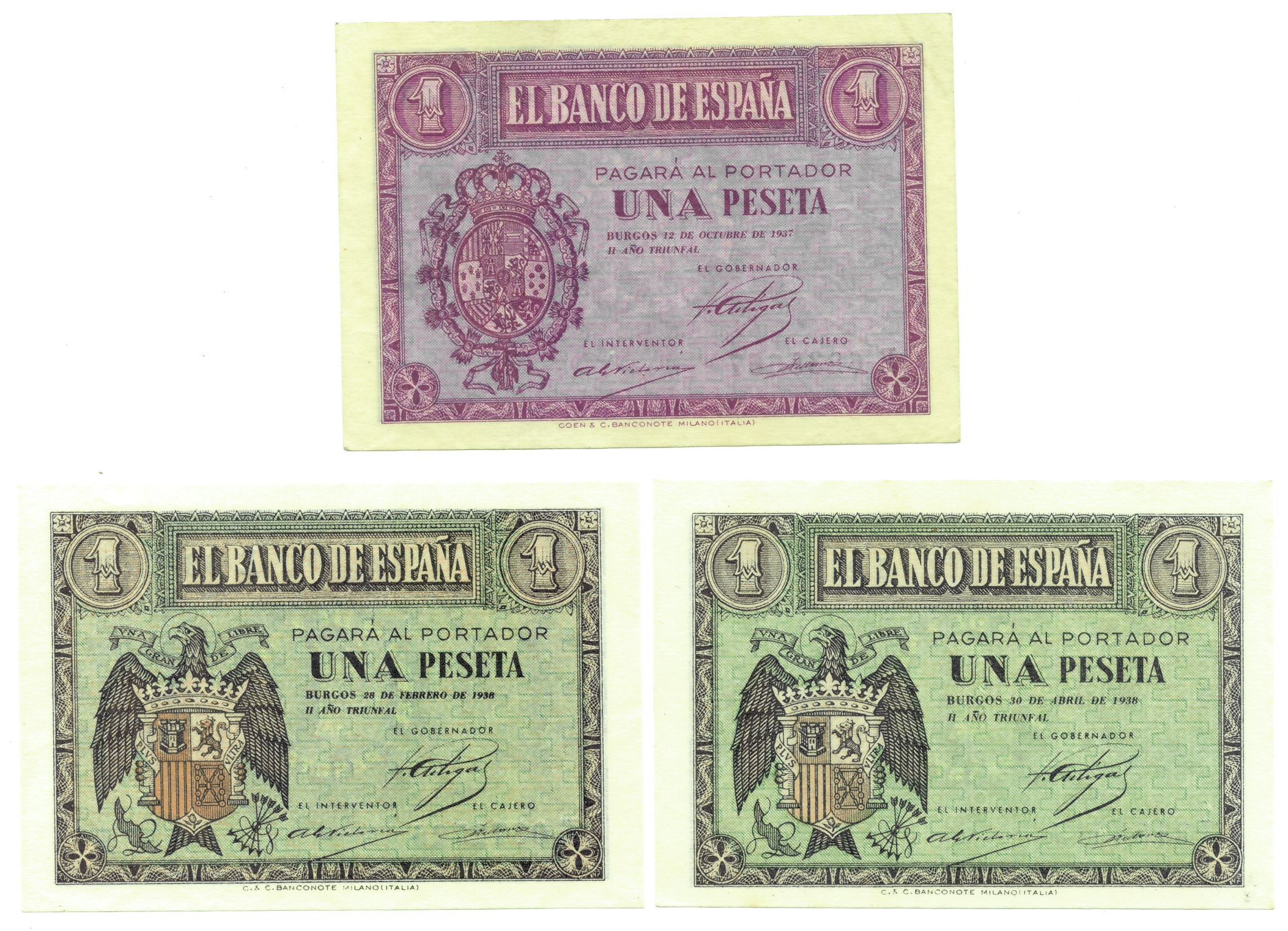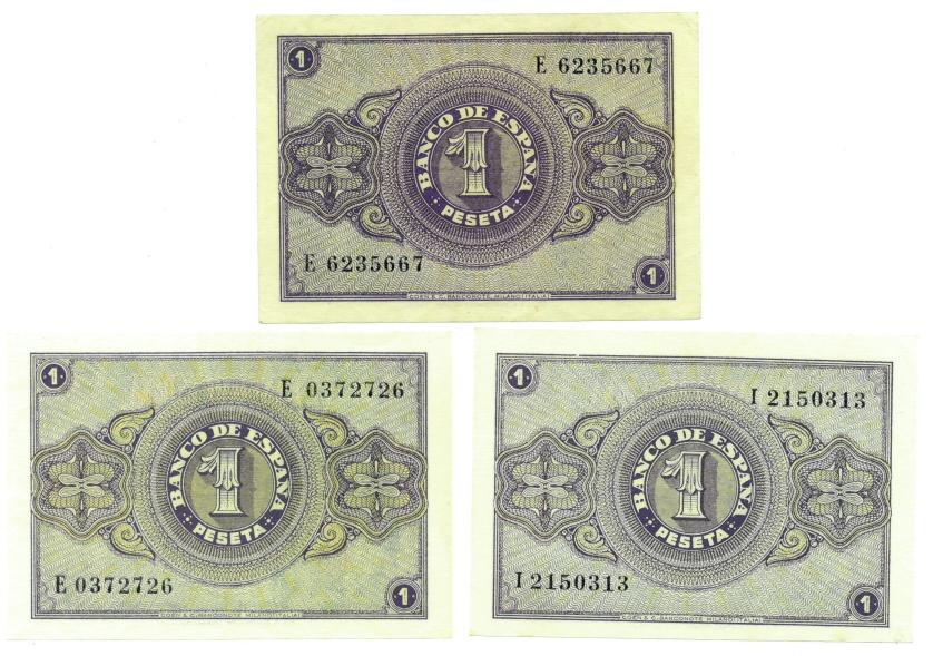 BILLETES ESPAÑOLES. BANCO DE ESPAÑA. Lote de 3 billetes. 1 peseta, 12 de octubre de 1937, serie E, ED-425a; 1 peseta, 28 de febrero de 1938, serie E, ED-472a; 1 peseta, 30 de abril de 1938, serie I. Serie E, ED-428a. SC- a SC.
