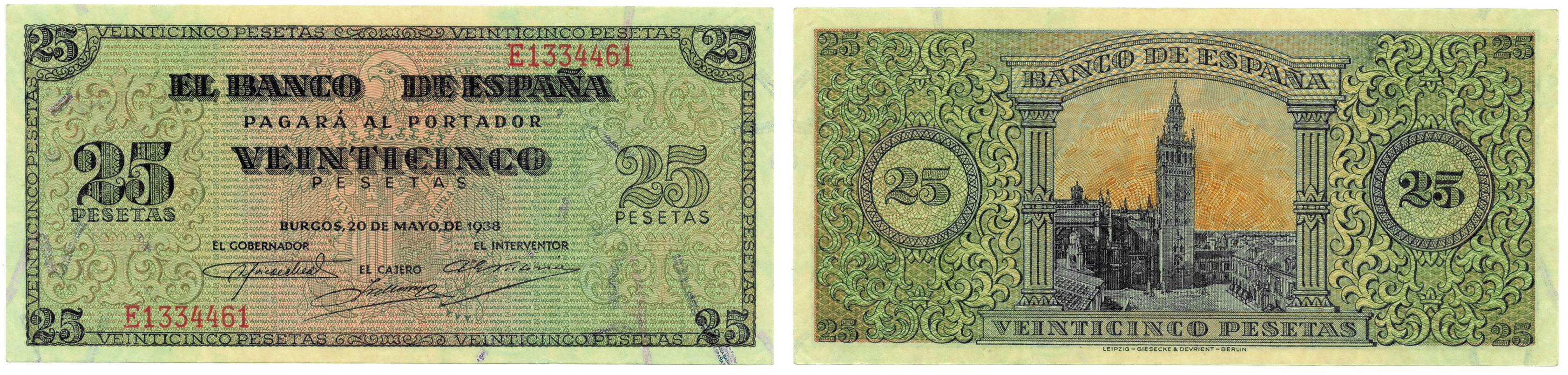 BILLETES ESPAÑOLES. BANCO DE ESPAÑA. 25 pesetas, 20 de mayo de 1938, Serie E, ED-430a. SC-.