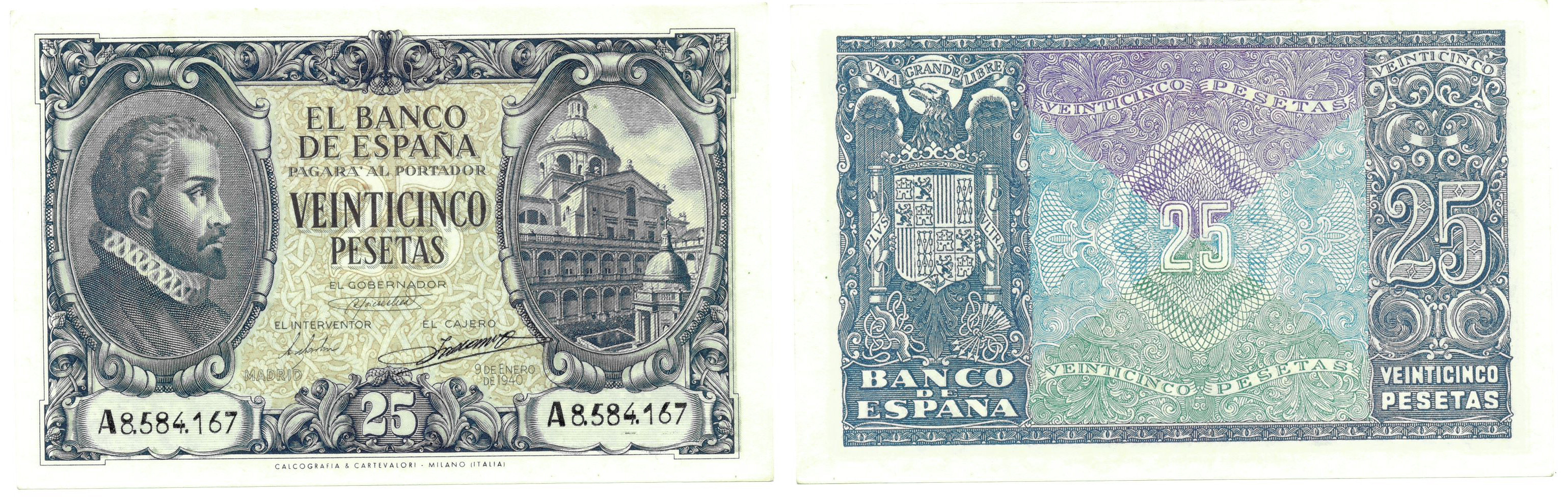 BILLETES ESPAÑOLES. BANCO DE ESPAÑA. 25 pesetas, 9 de enero de 1940, Serie A, ED-436. Precioso relieve tipográfico de la numeración. SC.