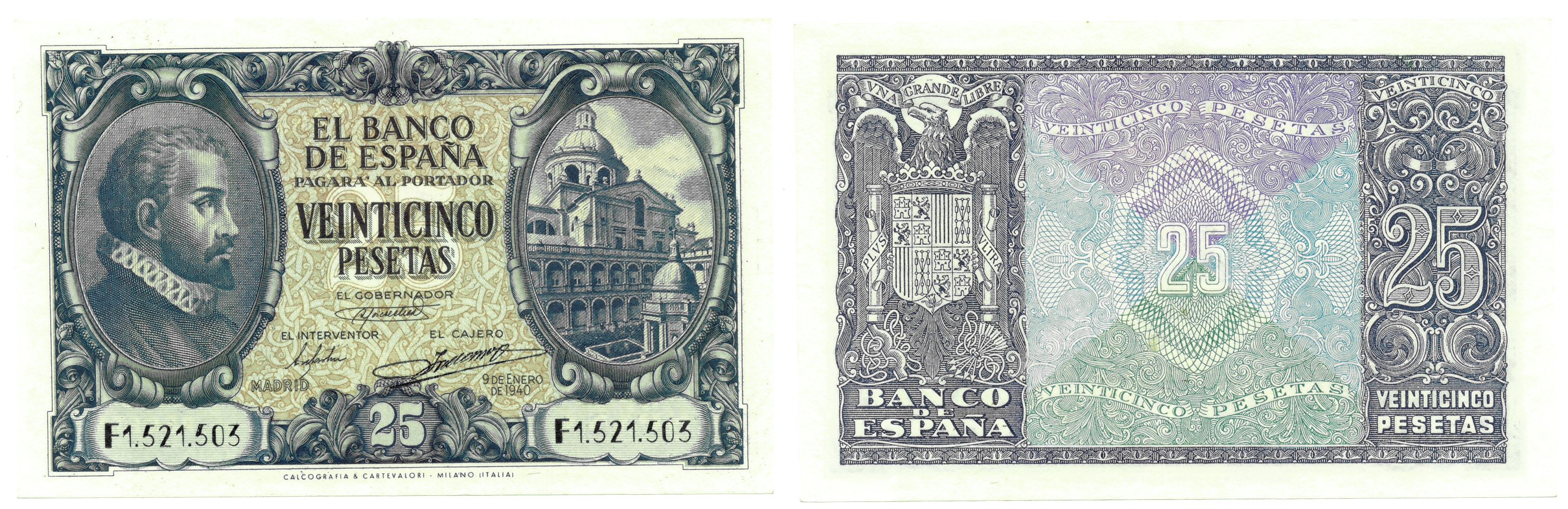 BILLETES ESPAÑOLES. BANCO DE ESPAÑA. 25 pesetas, 9 de enero de 1940, Serie F, ED-436b. Última serie emitida. SC.
