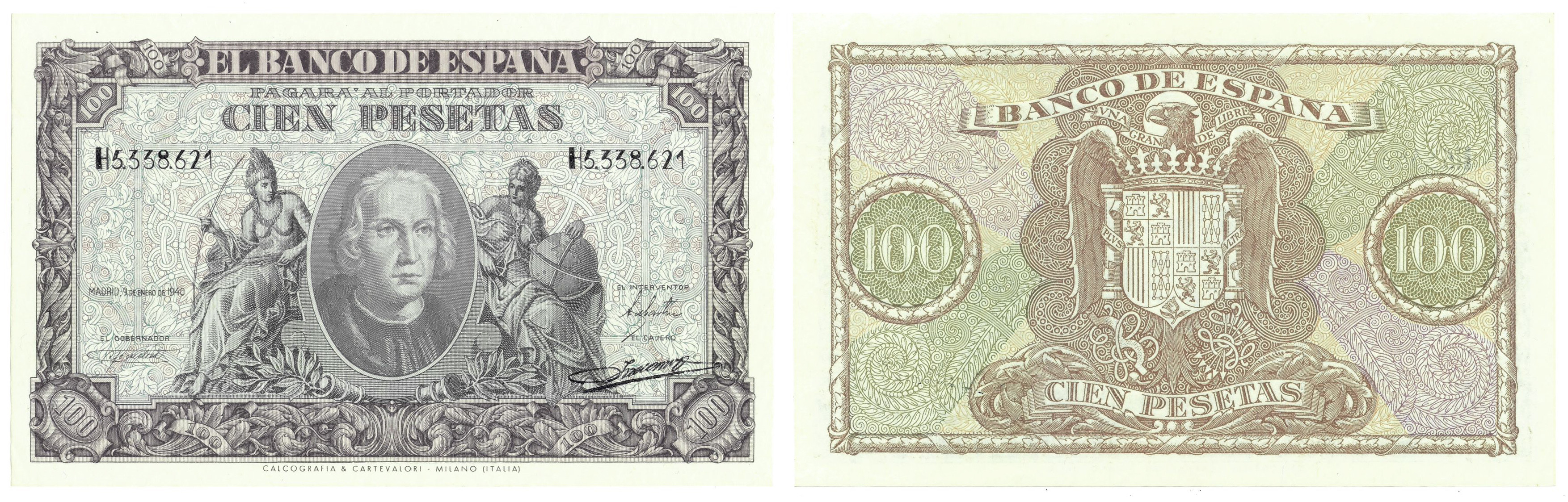 BILLETES ESPAÑOLES. BANCO DE ESPAÑA. 100 pesetas, 9 de enero de 1940, Serie H, ED-438a. Pico ligeramente doblado. Buen relieve tipográfico. SC-.