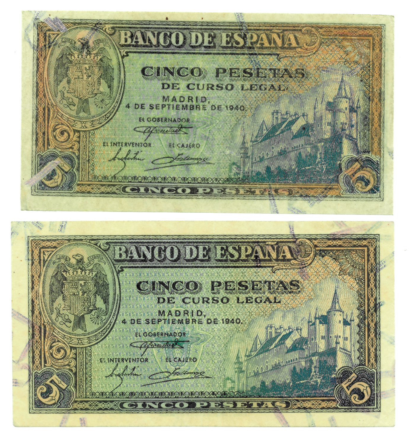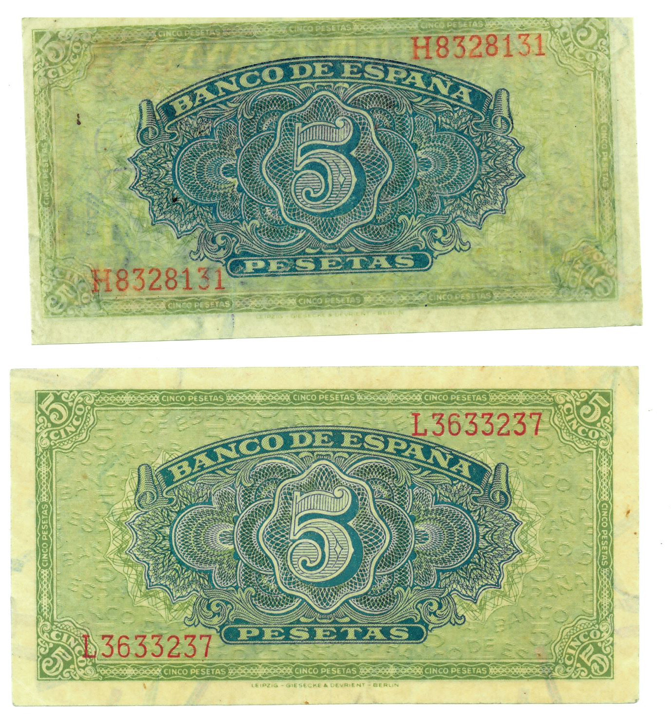 BILLETES ESPAÑOLES. BANCO DE ESPAÑA. Lote de 2 billetes. 5 pesetas, 4 de septiembre de 1940, Serie H y L, ED-443a. El serie H algo sucio, con piquito doblado, papel algo más fino y recortado. A EXAMINAR. EBC+ a SC-.