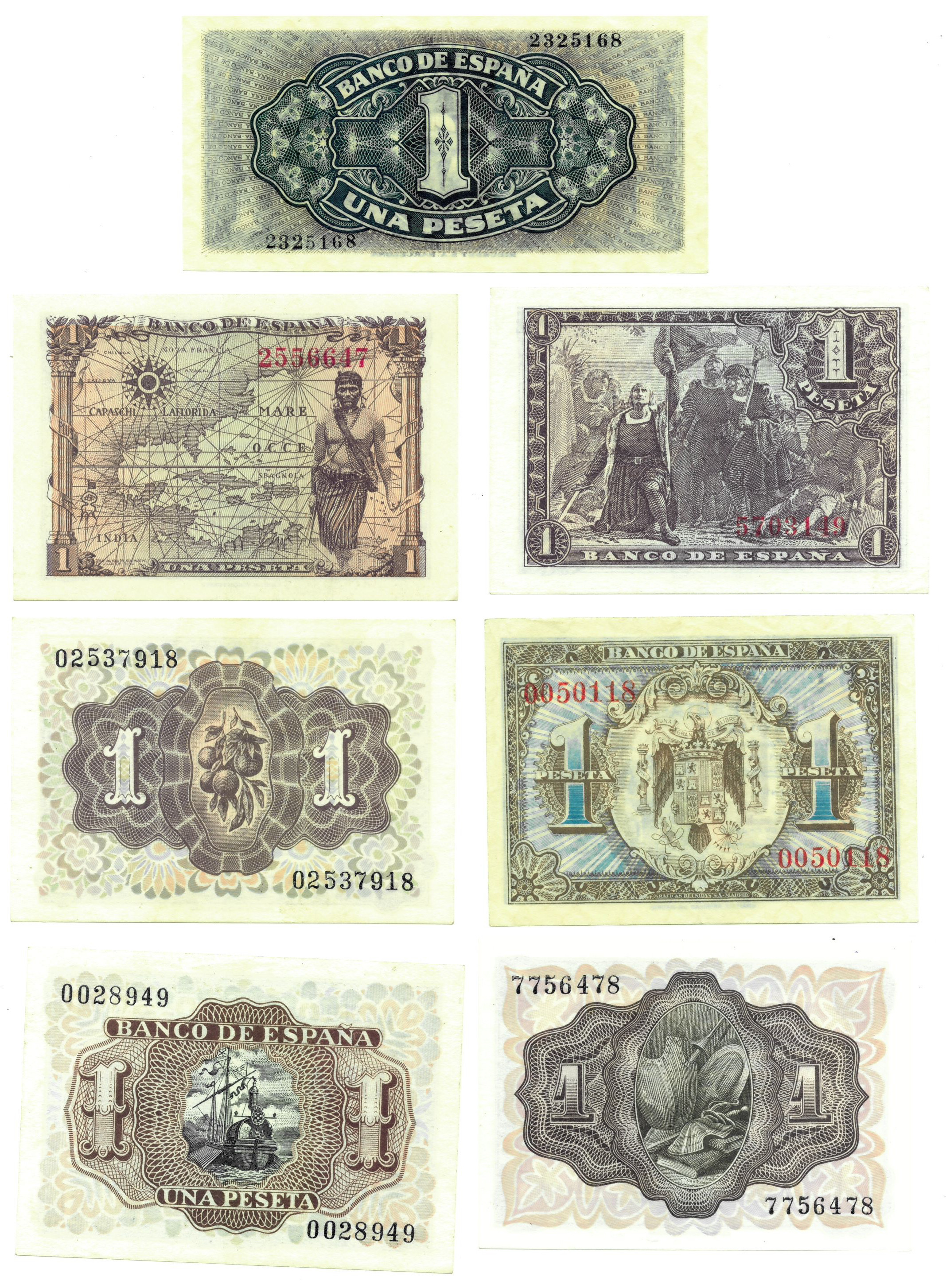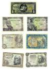BILLETES ESPAÑOLES. BANCO DE ESPAÑA. Lote de 7 billetes. 1 peseta, 1 de junio de 1940, sin serie, numeración no alta, ED-441; 1 peseta, 4 de septiembre de 1940, sin serie, ED-442; 1 peseta, 21 de mayo de 1943, sin serie, ED-447; 1 peseta, 15 de junio de 1945, sin serie, ED-448; 1 peseta, 19 de junio de 1948, sin serie, ED-457; 1 peseta, 19 de noviembre de 1951, sin serie, ED-461; 1 peseta, 22 de julio de 1953, sin serie, ED-465, numeración algo baja. EBC+ a SC.
