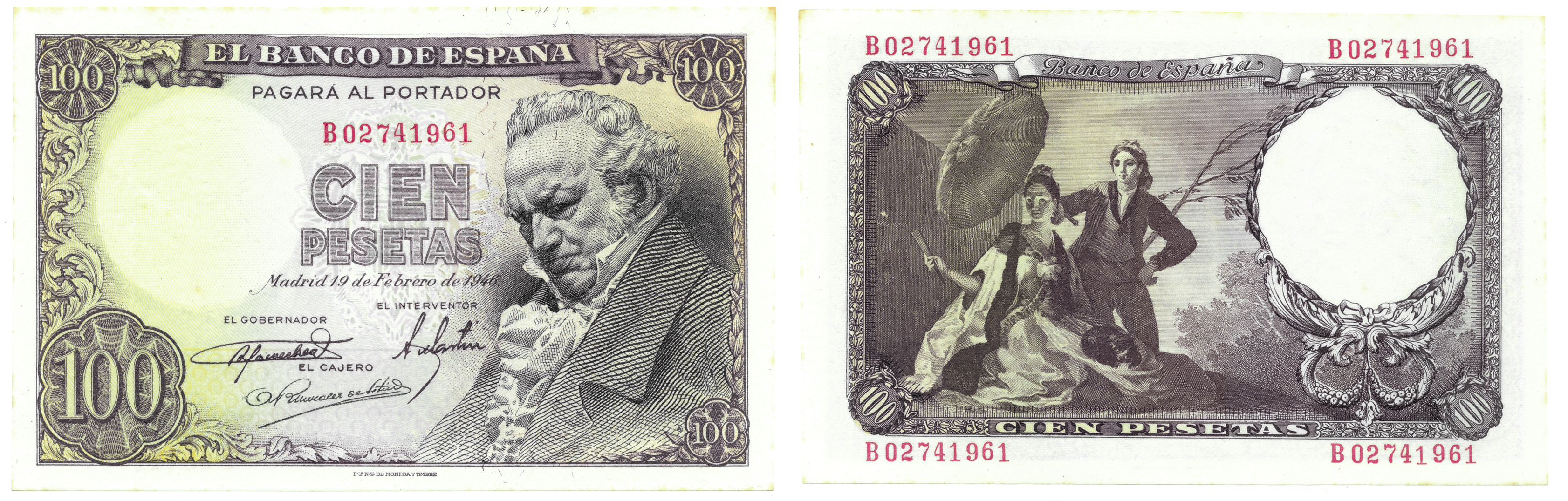BILLETES ESPAÑOLES. BANCO DE ESPAÑA. 100 pesetas, 19 de febrero de 1946, Serie B, ED-451b. Última serie emitida. Buen relieve tipográfico. SC.