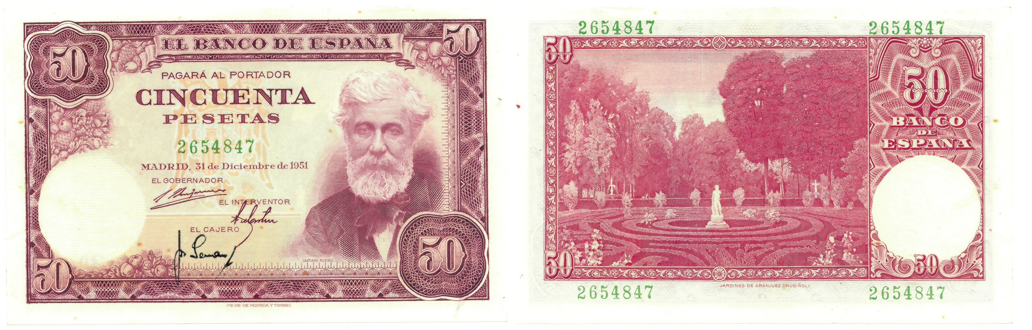 BILLETES ESPAÑOLES. BANCO DE ESPAÑA. 50 pesetas, 31 de diciembre de 1951, Sin serie, ED-452. Puntos de aguja. Manchas. Marca de manipulación. SC-.