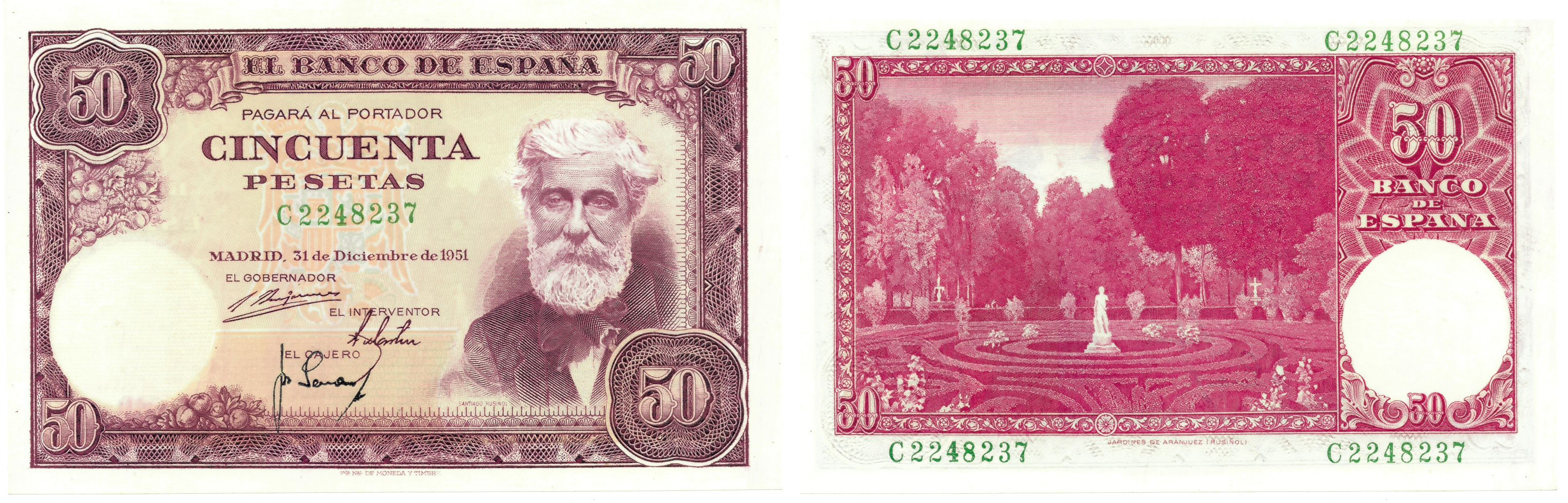 BILLETES ESPAÑOLES. BANCO DE ESPAÑA. 50 pesetas, 31 de diciembre de 1951, Serie C, ED-452a. Última serie emitida. Marca de manipulación. SC-.