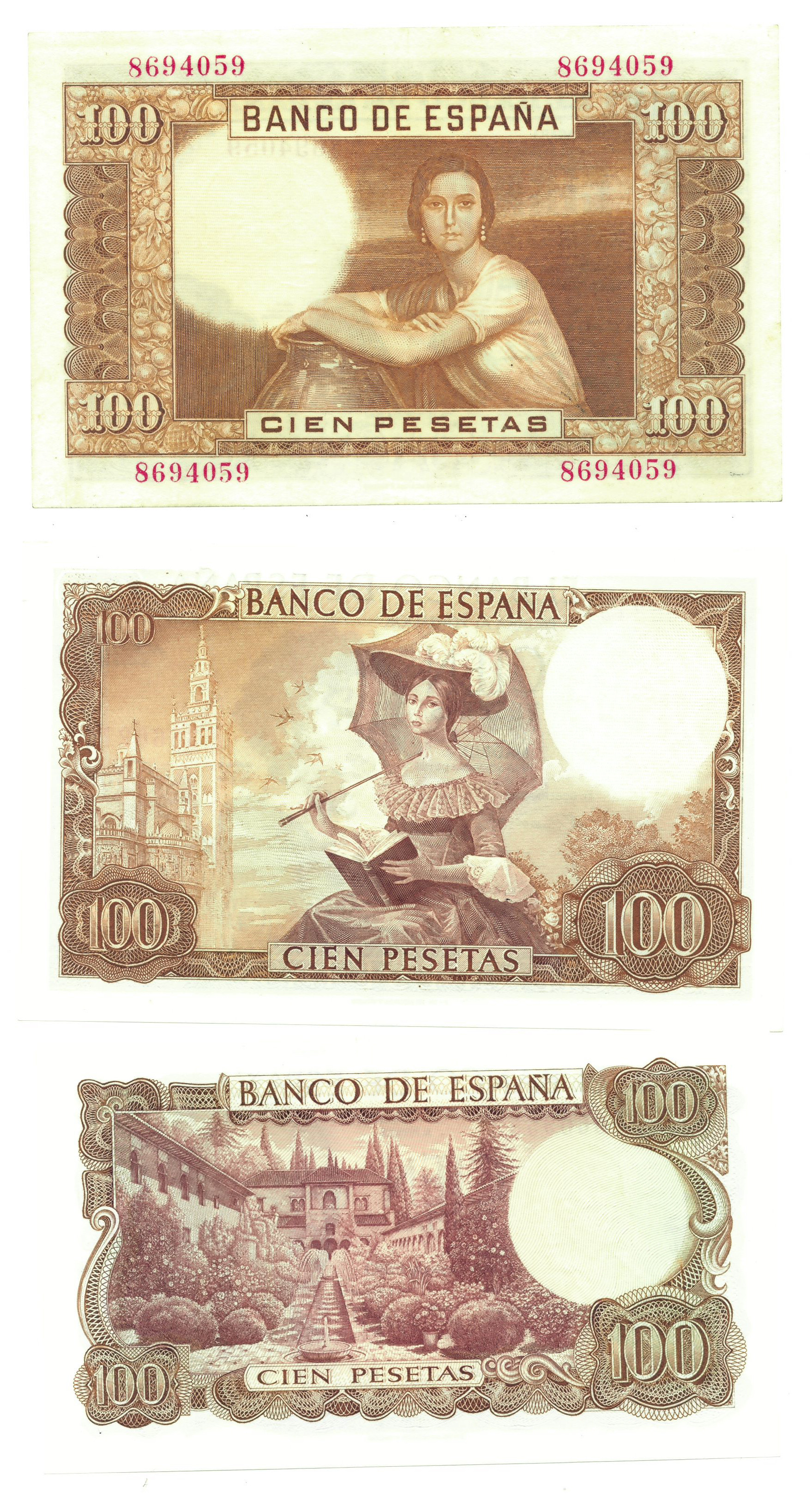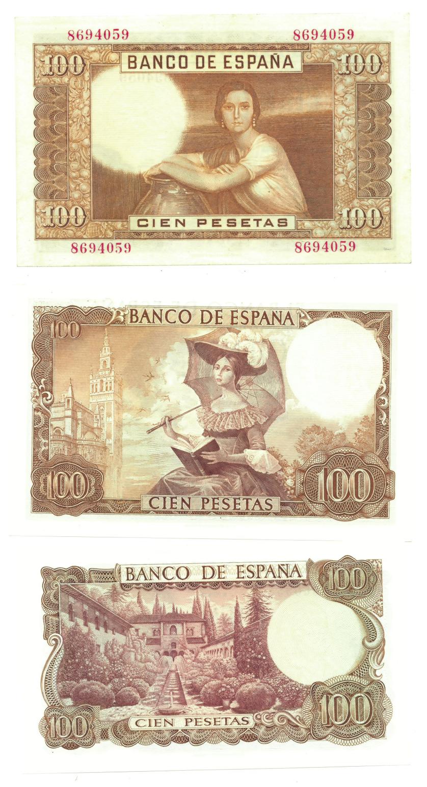 BILLETES ESPAÑOLES. BANCO DE ESPAÑA. 100 pesetas, 7 de abril de 1953, Sin serie, ED-464. Algo sucio en margen inferior. EBC+; 100 pesetas, 19 de noviembre de 1965, Sin serie, ED-470. Dos picos levemente doblados, SC-; 100 pesetas, 17 de noviembre de 1970, Sin serie, ED-472. SC.