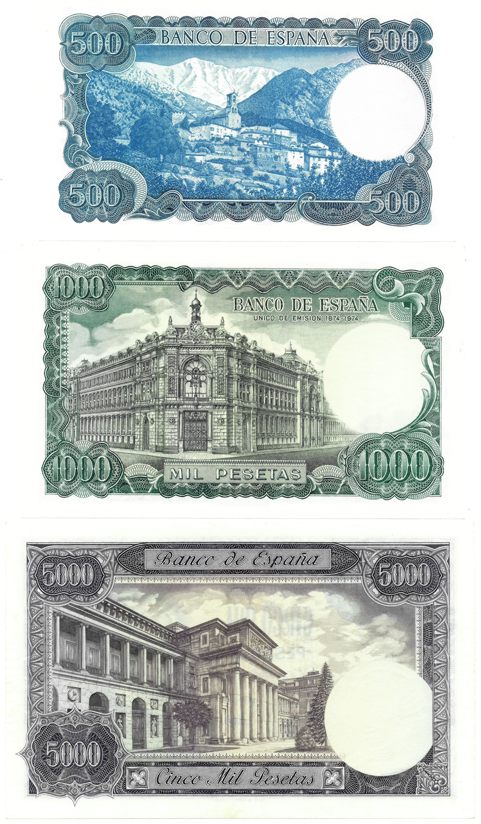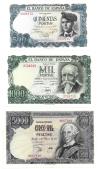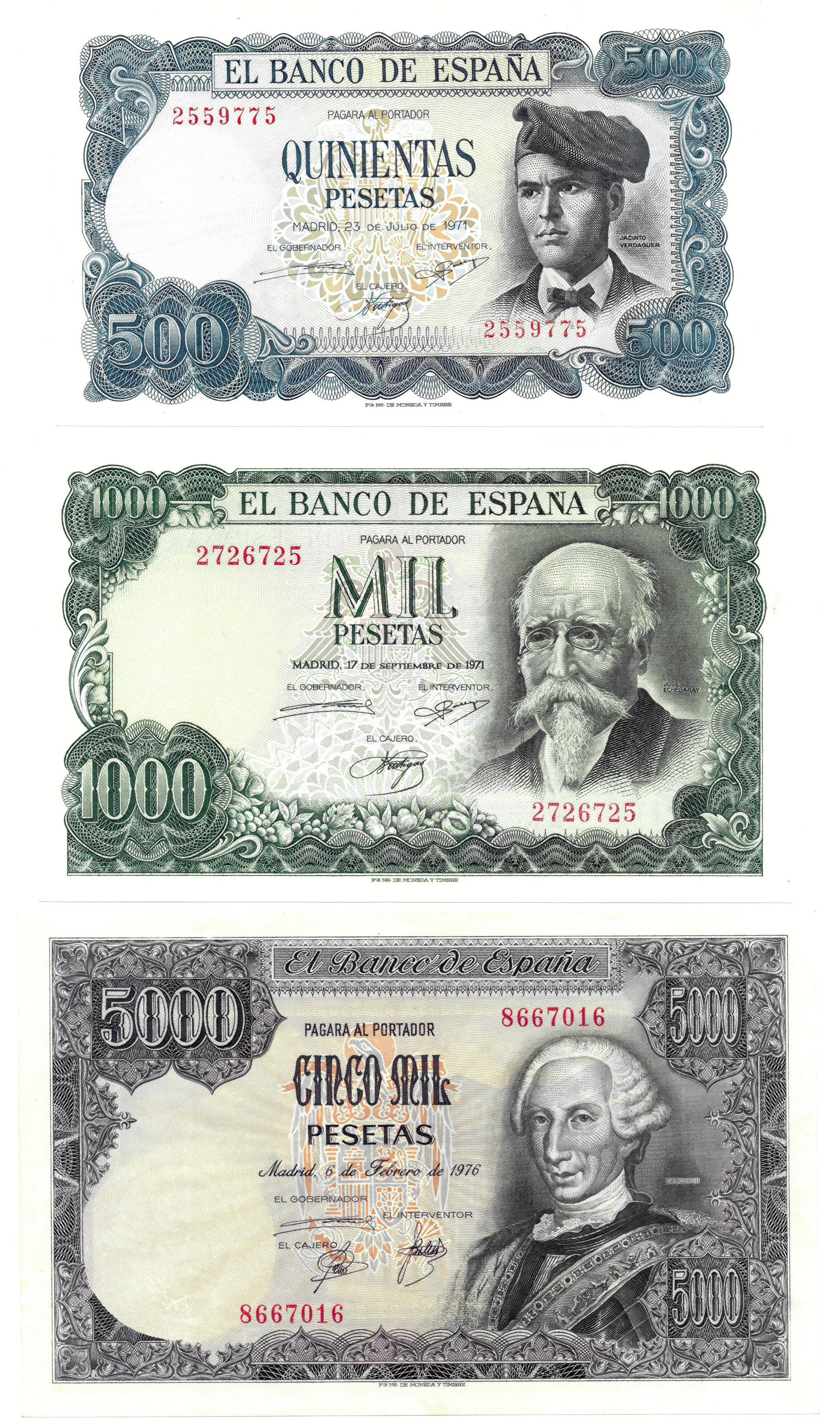 BILLETES ESPAÑOLES. BANCO DE ESPAÑA. Lote de 3 billetes. 500 pesetas, 23 de julio de 1971, Sin serie, ED-473. Levísima marca de conteo en margen superior. Un pico ligerísimamente tocado; 1000 pesetas, 17 de septiembre de 1971, Sin serie, ED-474. Marquitas ínfimas de manipulación en ambos laterales. Prensado; 5000 pesetas, 6 de febrero de 1976, Sin serie, ED-475. Mínimas marcas de manipulación. SC-.
