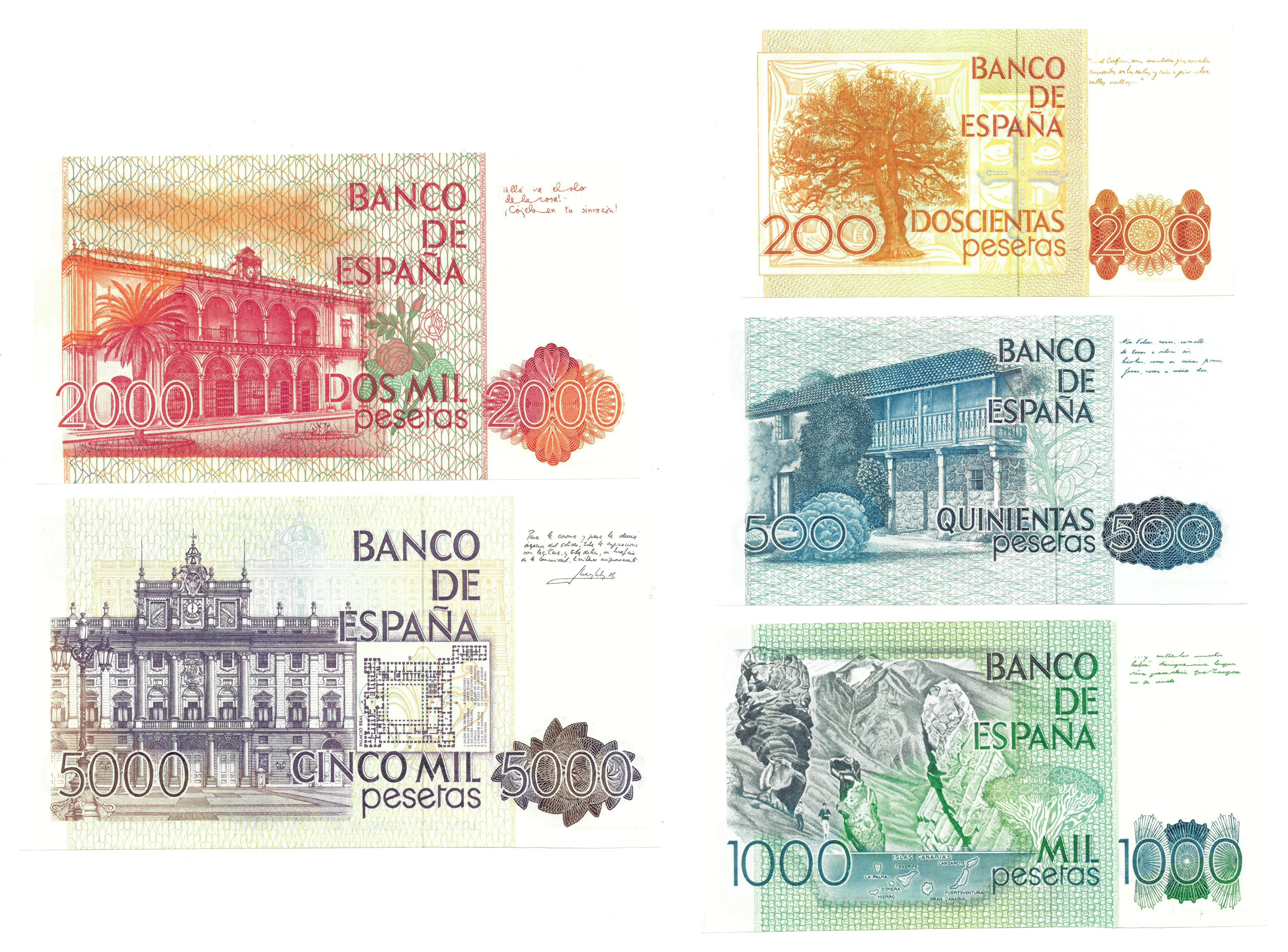 BILLETES ESPAÑOLES. BANCO DE ESPAÑA. Lote de 5 billetes. 500 pesetas, 29 de octubre de 1979, Sin serie, ED-476; 1000 pesetas, 29 de octubre de 1979, Sin serie, ED-477; 5000 pesetas, 23 de octubre de 1979, Sin serie, ED-478; 200 pesetas, 16 de septiembre de 1980, Sin serie, ED-480. Minúscula marca de conteo en margen superior; Interesante lote de billetes sin letra de serie; 2000 pesetas, 22 de julio de 1980, Sin serie, ED-479. Grumito de papel. Marca de manipulación en margen. SC- a SC.