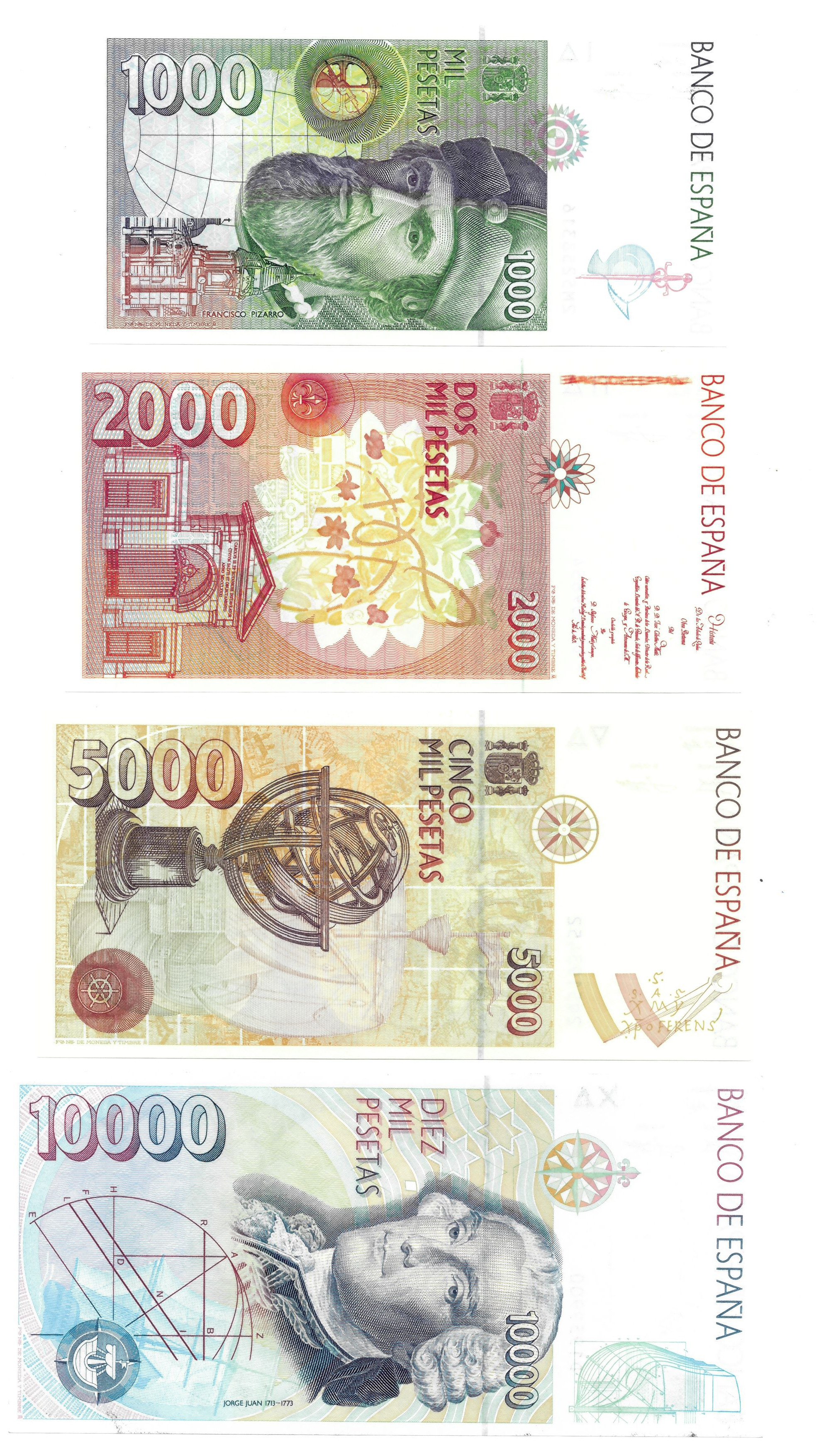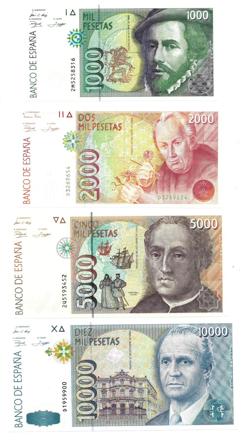 BILLETES ESPAÑOLES. BANCO DE ESPAÑA. 1000 pesetas, 12 de octubre de 1992, Serie 2M, ED-483b; 2000 pesetas, 24 de abril de 1992, Serie D, ED-482a; 5000 pesetas, 12 de octubre de 1992, Serie 2Q, ED-484a; 10000 pesetas, 12 de octubre de 1992, Serie D, ED-485a. Pico tocado. SC- a SC.