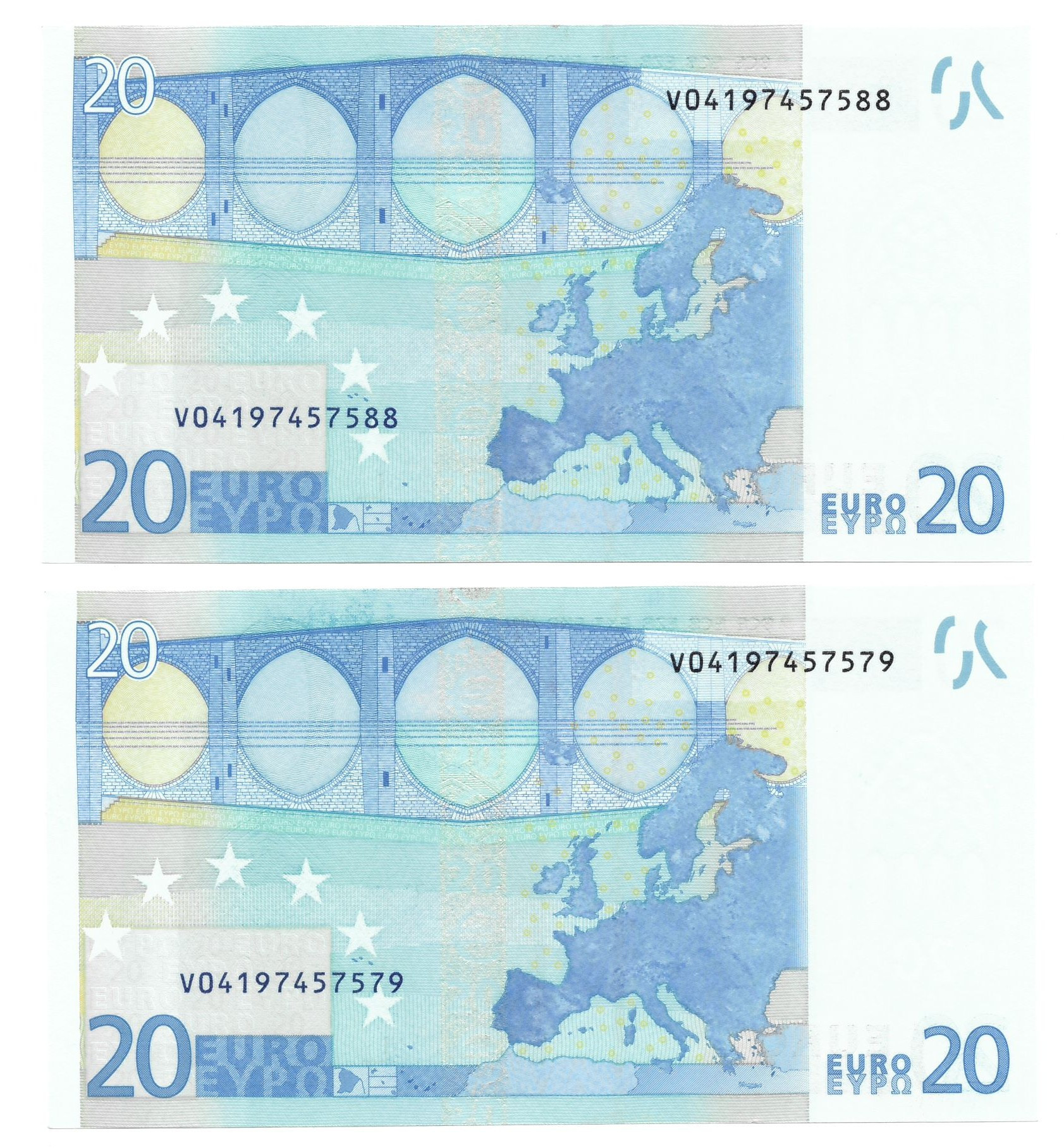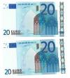 BILLETES ESPAÑOLES. BANCO DE ESPAÑA. Lote de 2 billetes. 20 euros, 2002, Serie V (España), ED-488. Firma de Duisenberg. Pareja correlativa. SC.