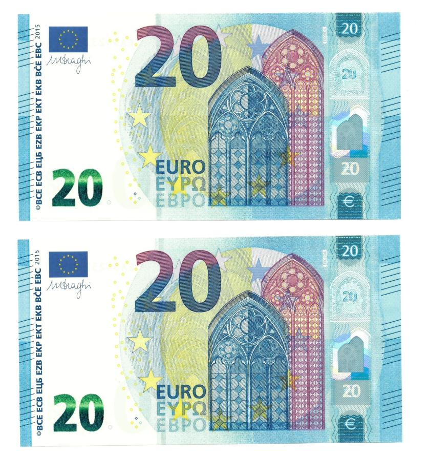 BILLETES ESPAÑOLES. BANCO DE ESPAÑA. Lote de 2 billetes. 20 euros, 2015. Serie Europa, Serie EA (Eslovaquia), ED-. Firma de Draghi. Pareja correlativa. SC.