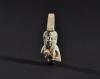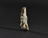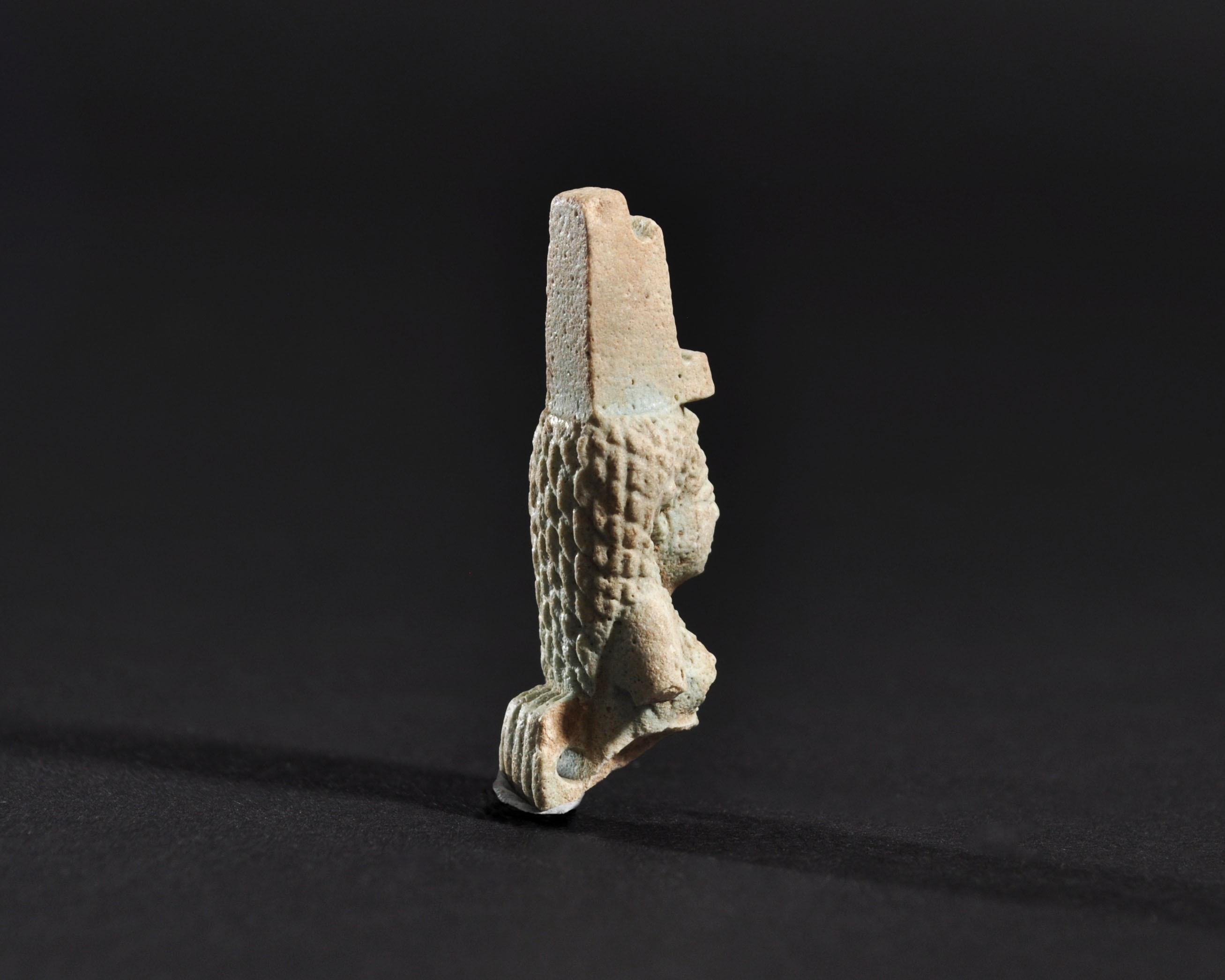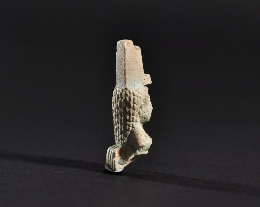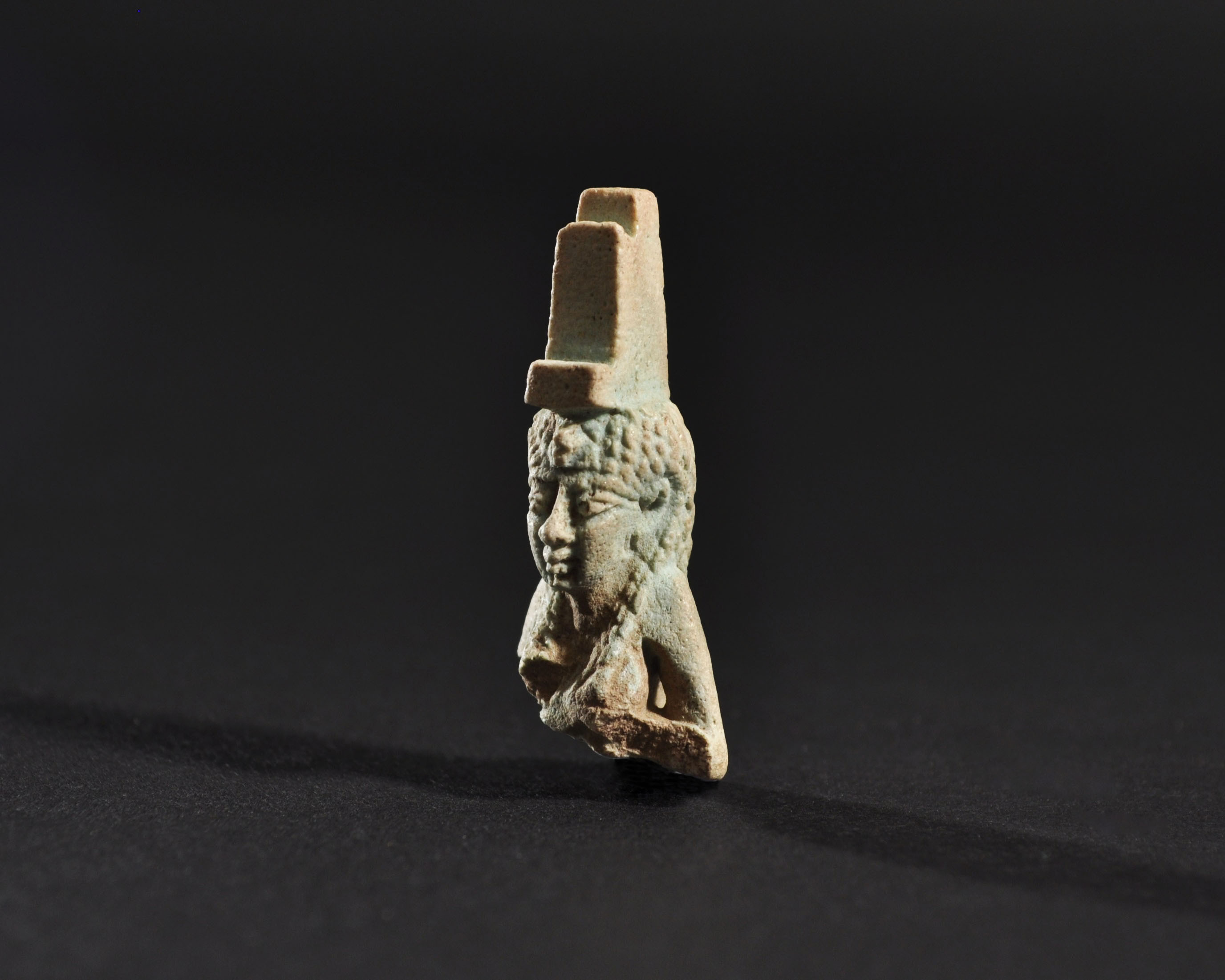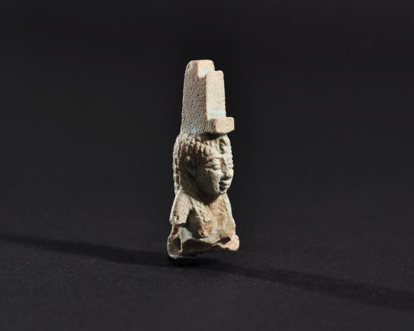 ARQUEOLOGÍA. EGIPTO. Baja Época. Fragmento de amuleto de la diosa Isis con corona en forma de trono (664-332 a.C.). Fayenza. Longitud 4 cm. Presenta referencia de catalogación en su parte inferior.