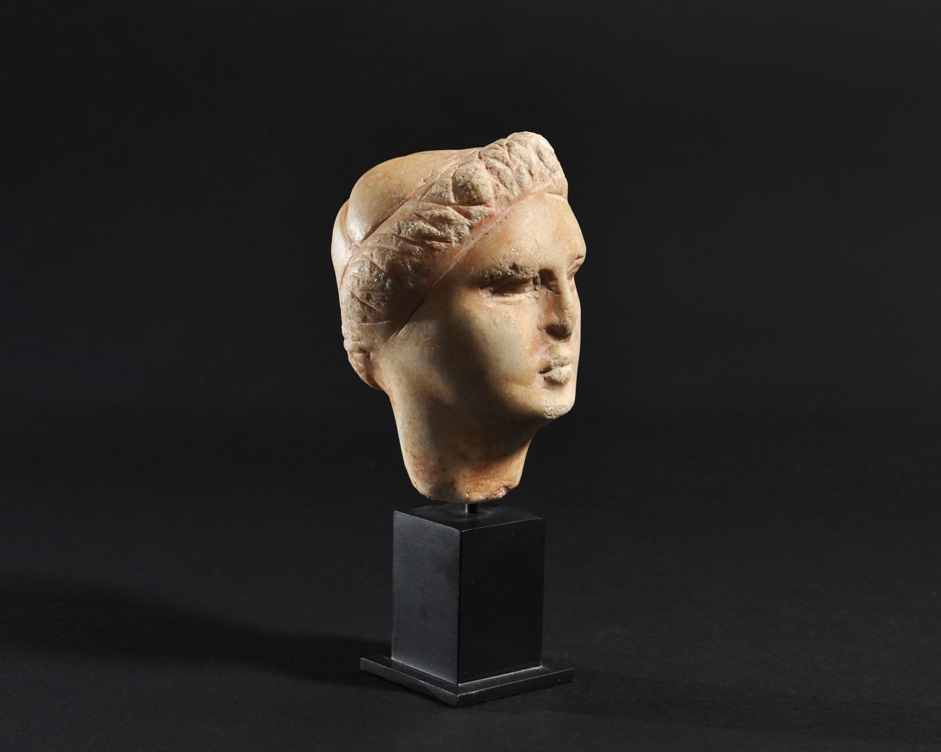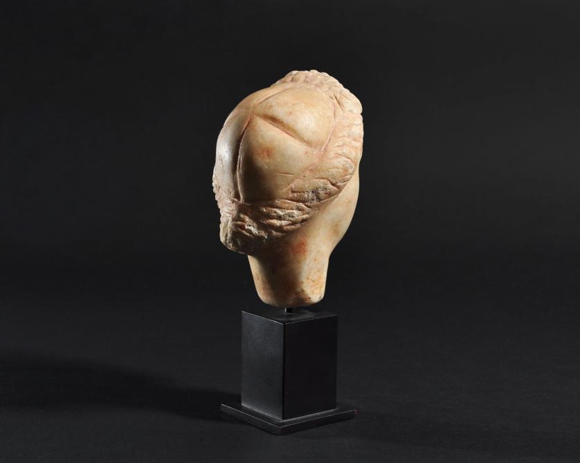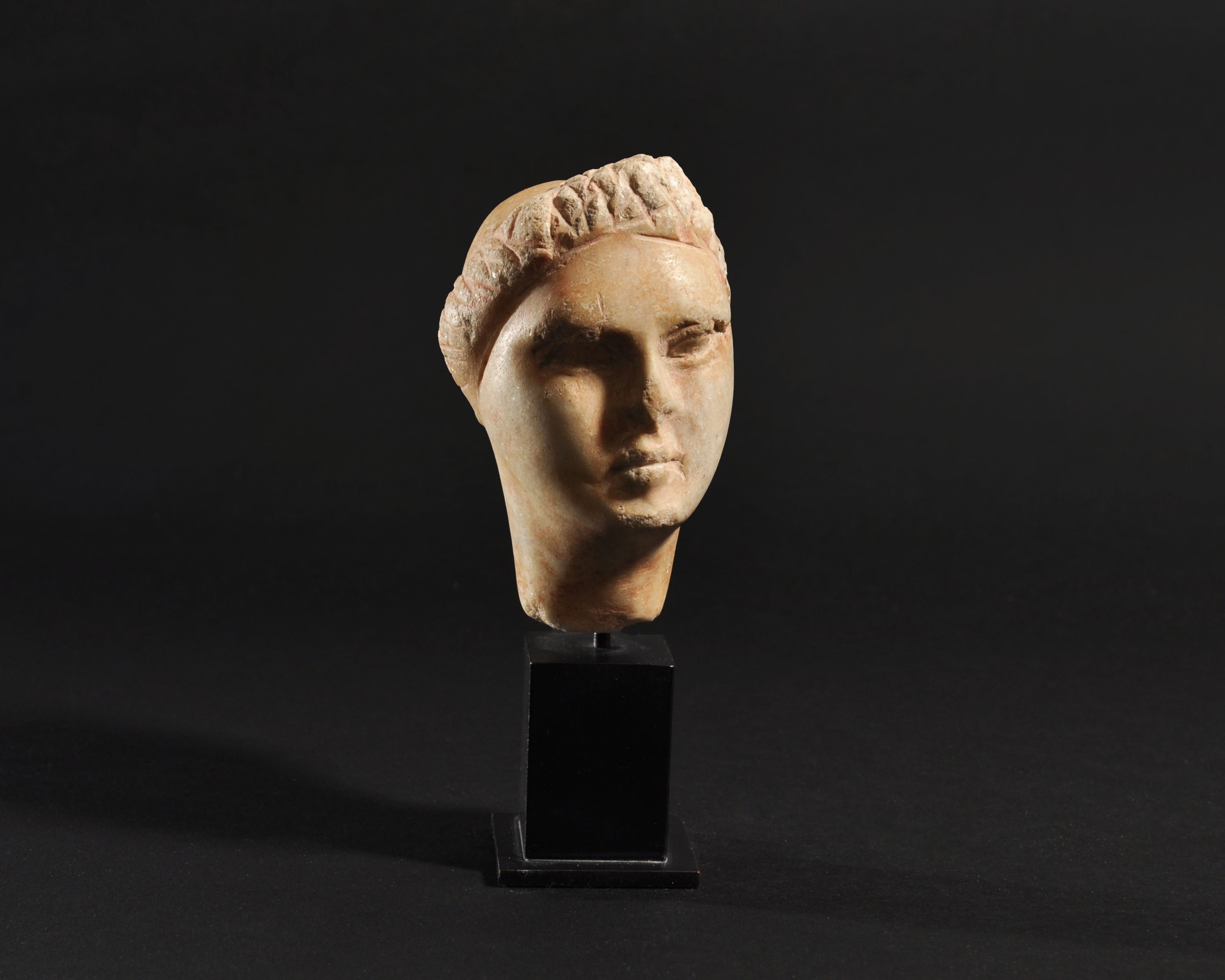ARQUEOLOGÍA. ROMA. Cabeza femenina (ss. I-IV d.C.). Mármol. Altura 11,5 cm. Incluye peana.