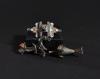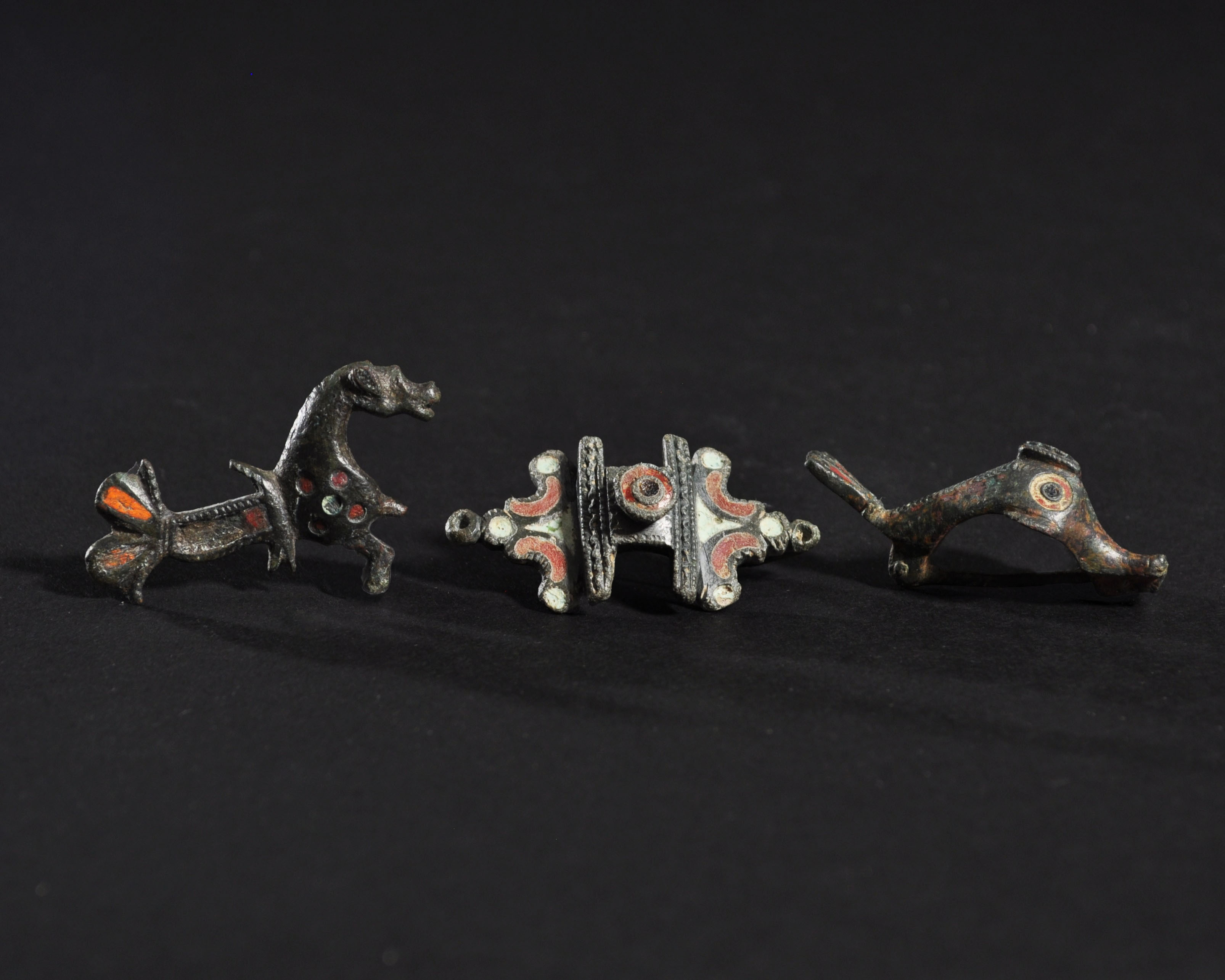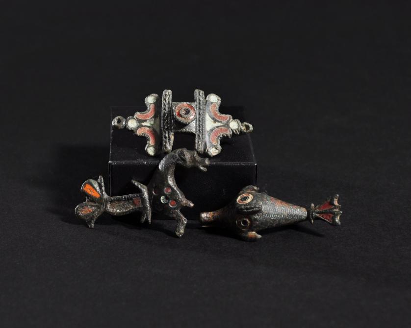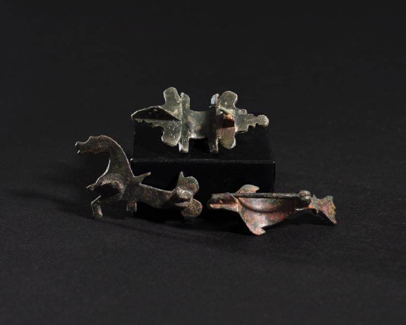 ARQUEOLOGÍA. ROMA. Lote de 3 fíbulas, una de ellas en forma de hipocampo y otra, de delfín (ss. I-III d.C.). Bronce y esmalte. Longitud de 4,2 a 4,4 cm. Dos de ellas sin aguja.